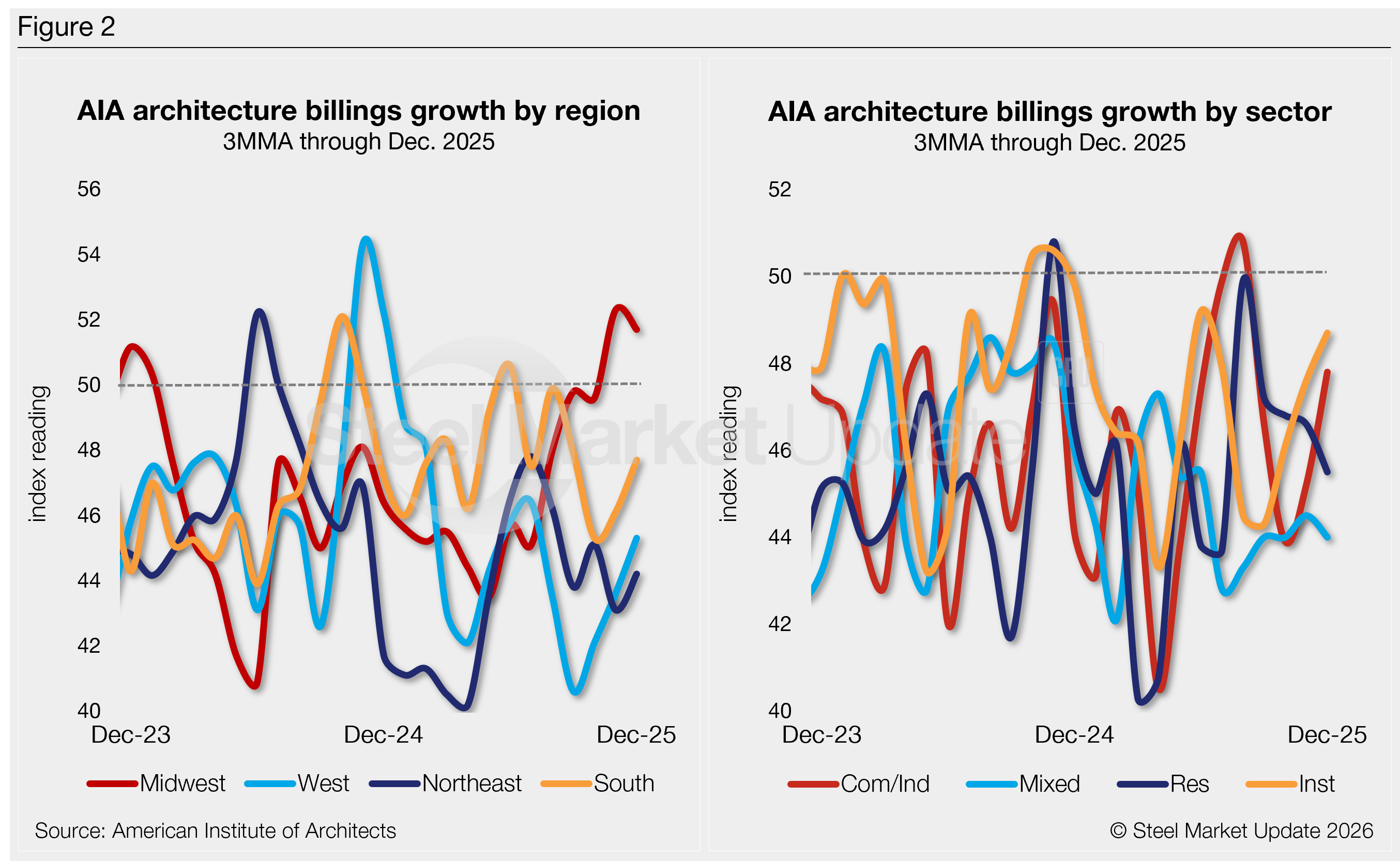 Two of the sub-sector indices were also up from November (institutional and commercial/industrial), but all continue to indicate a reduction in billings. Residential was down 1.1 points to 45.5 (Figure 2, right), while institutional was up 1.1 points to 48.7.