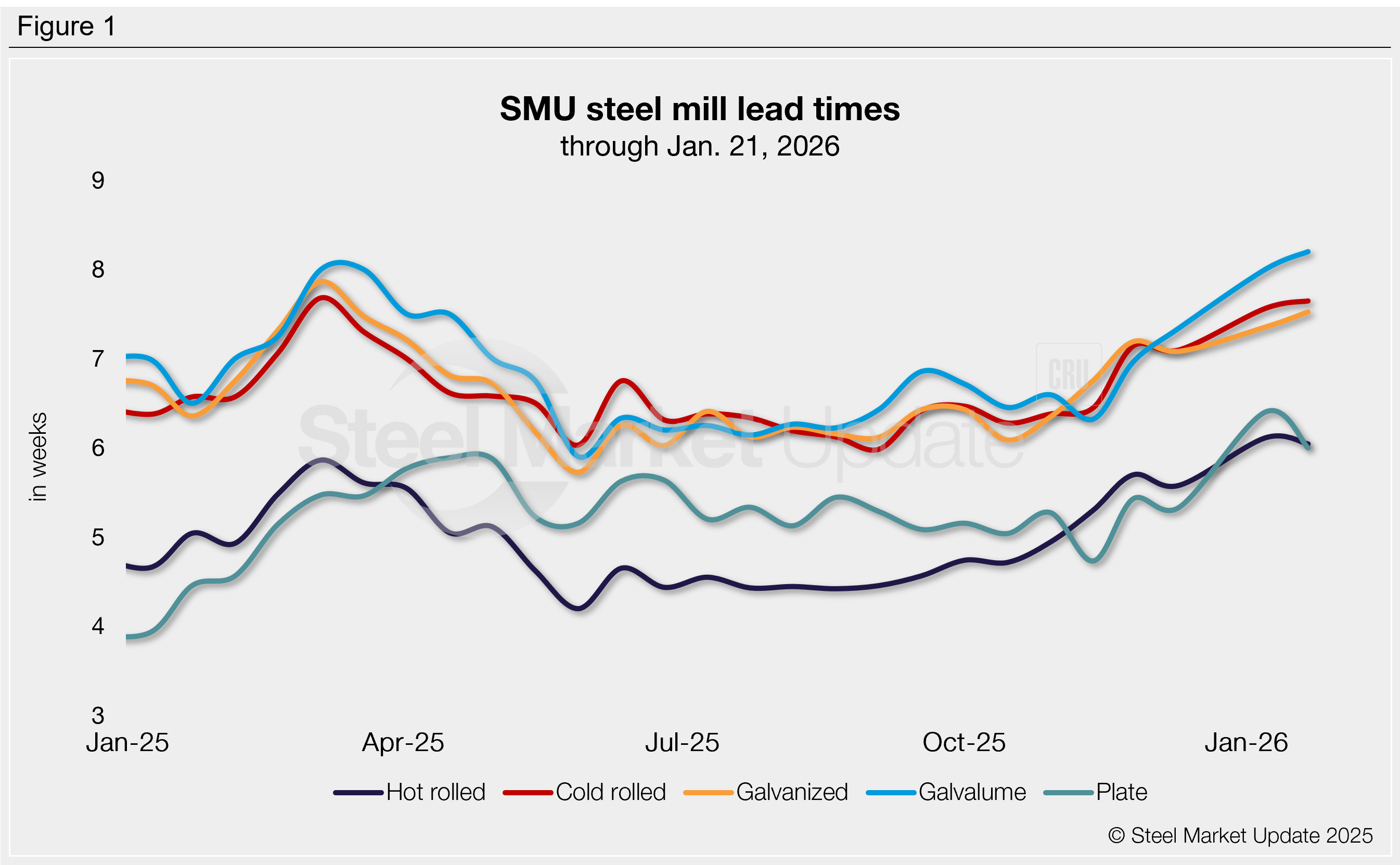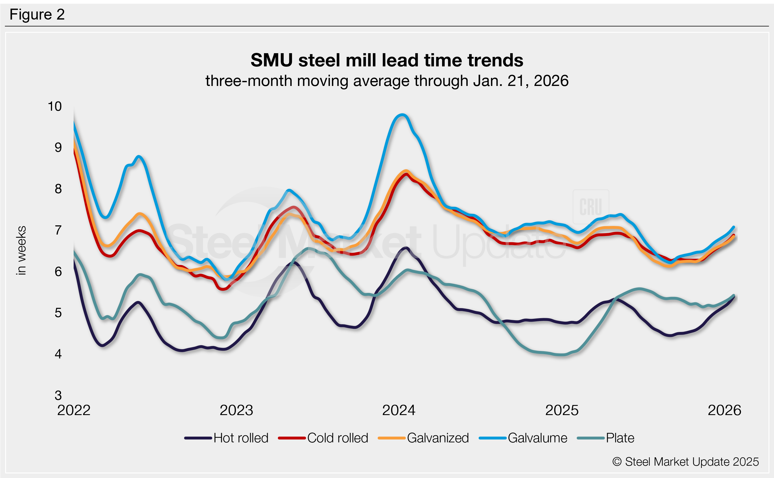 Steel mill lead times held steady on most products this week following the surge seen in early January, according to responses from SMU’s latest market survey. Lead times for sheet products saw minor movements, while plate times eased by a few days. Overall, lead times remain one to two weeks longer than levels seen three months ago.