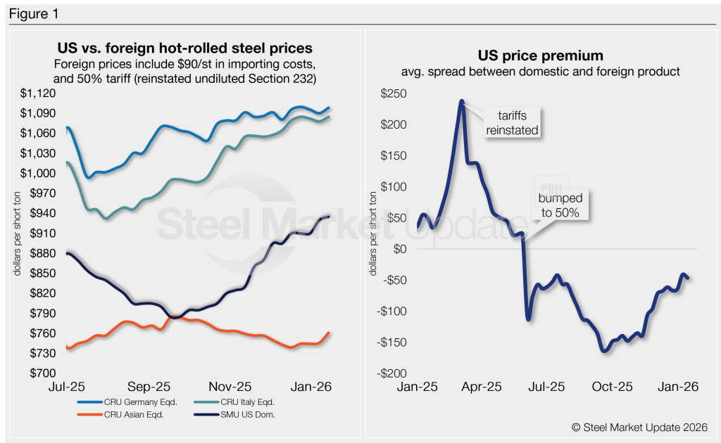 As of Wednesday, Jan. 21, the CRU Asian HRC price was $443/st, $4/st lower w/w. Adding a 50% tariff and $90/st in estimated import costs, the delivered price of Asian hot band to the US is ~$754/st. As noted above, the latest SMU US HR price is $945/st on average.
