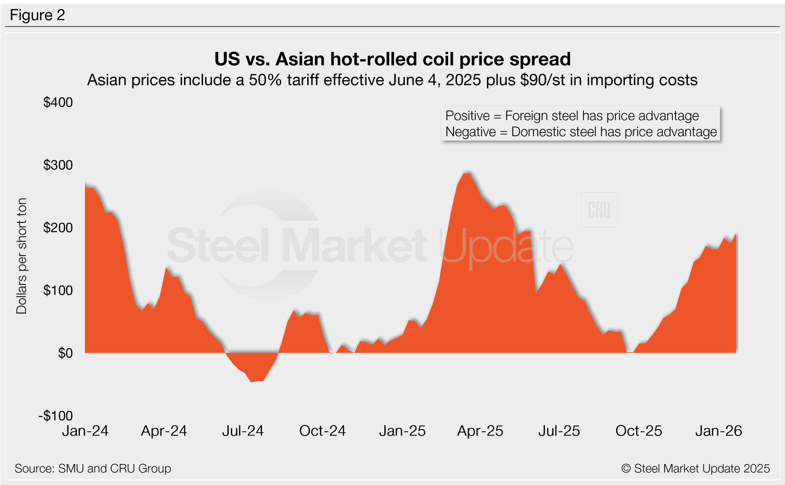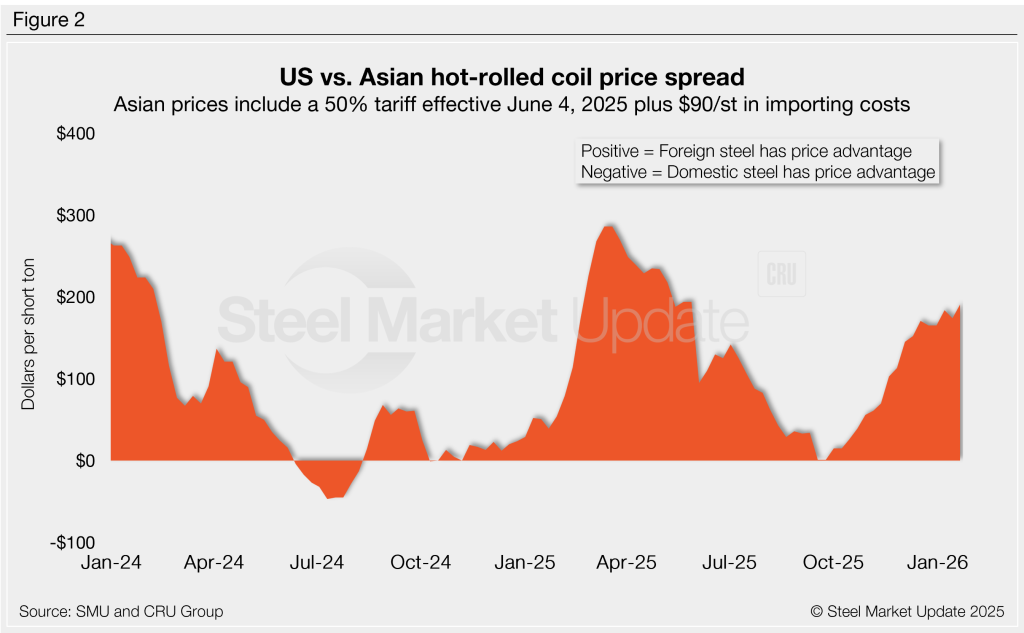 The result: Prices for US-produced HR are theoretically $191/st above steel imported from Asia — up ~$17/st w/w and up $26/st vs. last month.