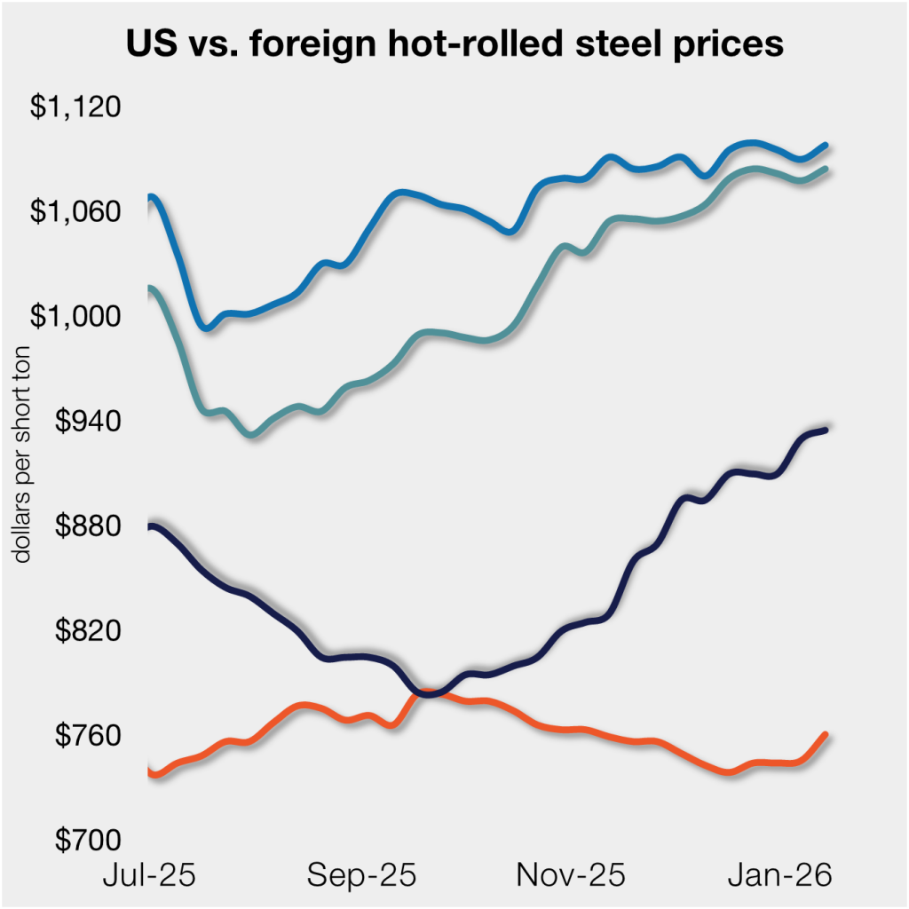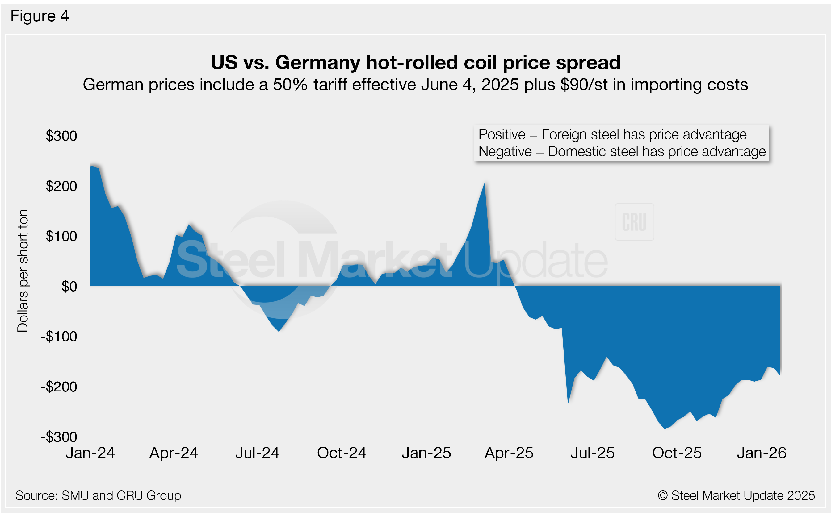 The difference maker remains the 50% Section 232 tariffs. As a result, most imports are marginally more expensive than domestic material. But the gap closed throughout the fourth quarter.
