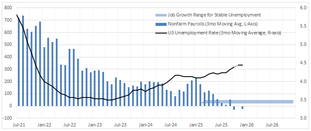The chart below highlights how quickly labor market dynamics have shifted. The blue bars represent the three-month moving average of nonfarm payrolls, the black line represents the three-month moving average of the unemployment rate, and the shaded region represents that 20-50k range needed to be stable.