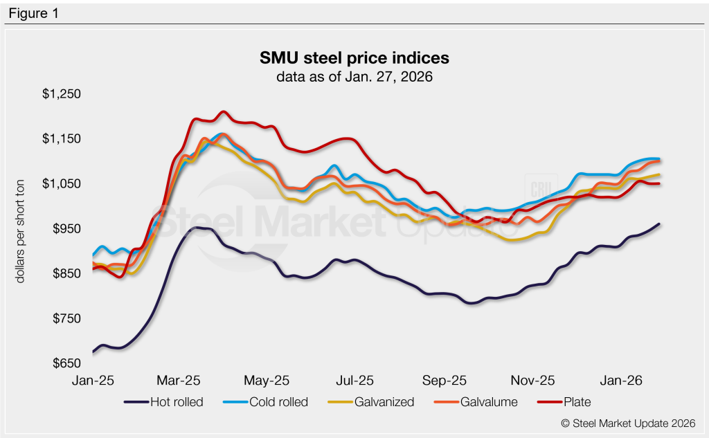 Hot-rolled lead times range from 5–8 weeks, averaging 6.0 weeks as of our Jan. 22 market survey.