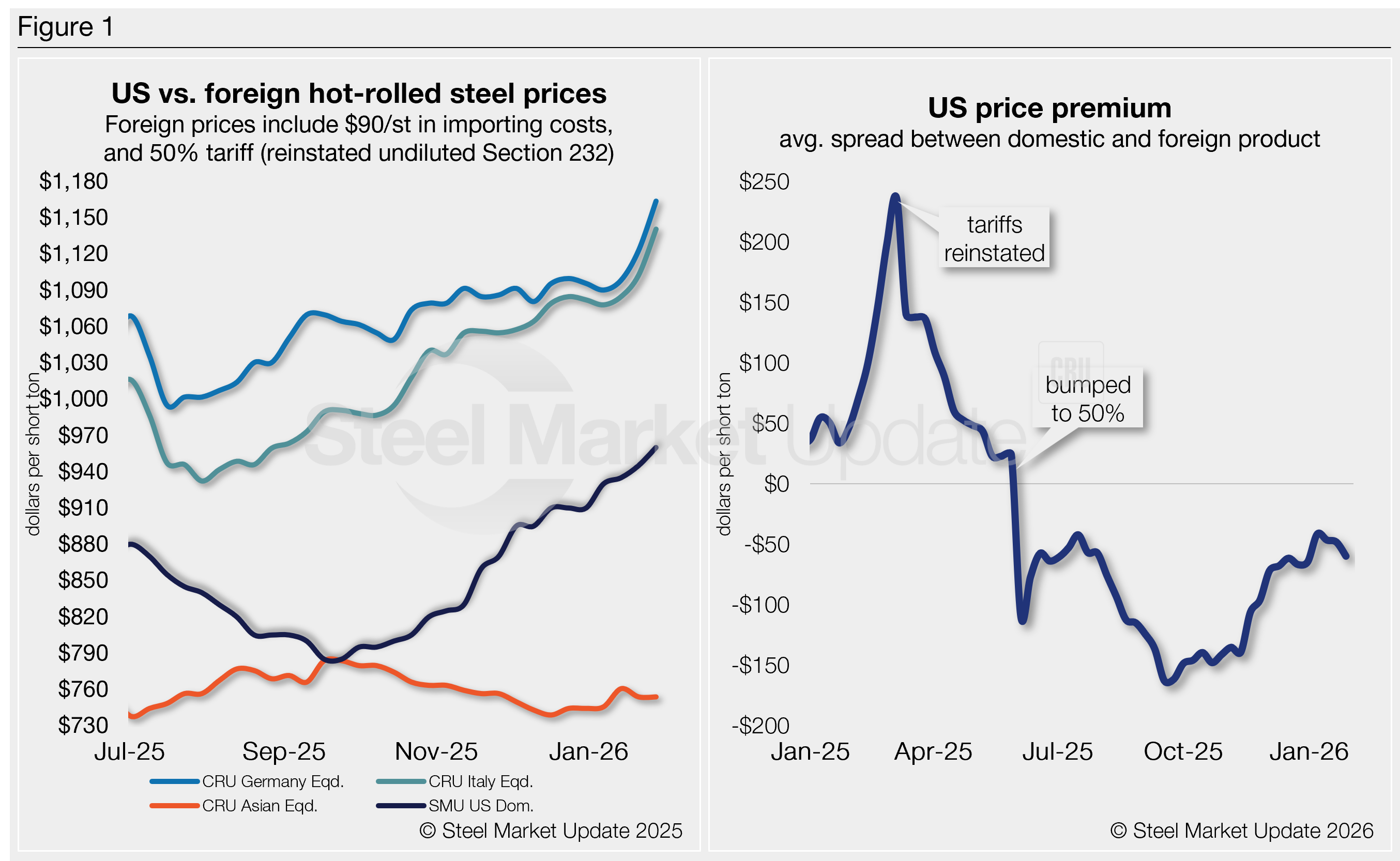 As of Wednesday, Jan. 28, the CRU Asian HRC price was $443/st, unchanged w/w. Adding a 50% tariff and $90/st in estimated import costs, the delivered price of Asian hot band to the US is ~$754/st. As noted above, the latest SMU US HR price is $960/st on average.