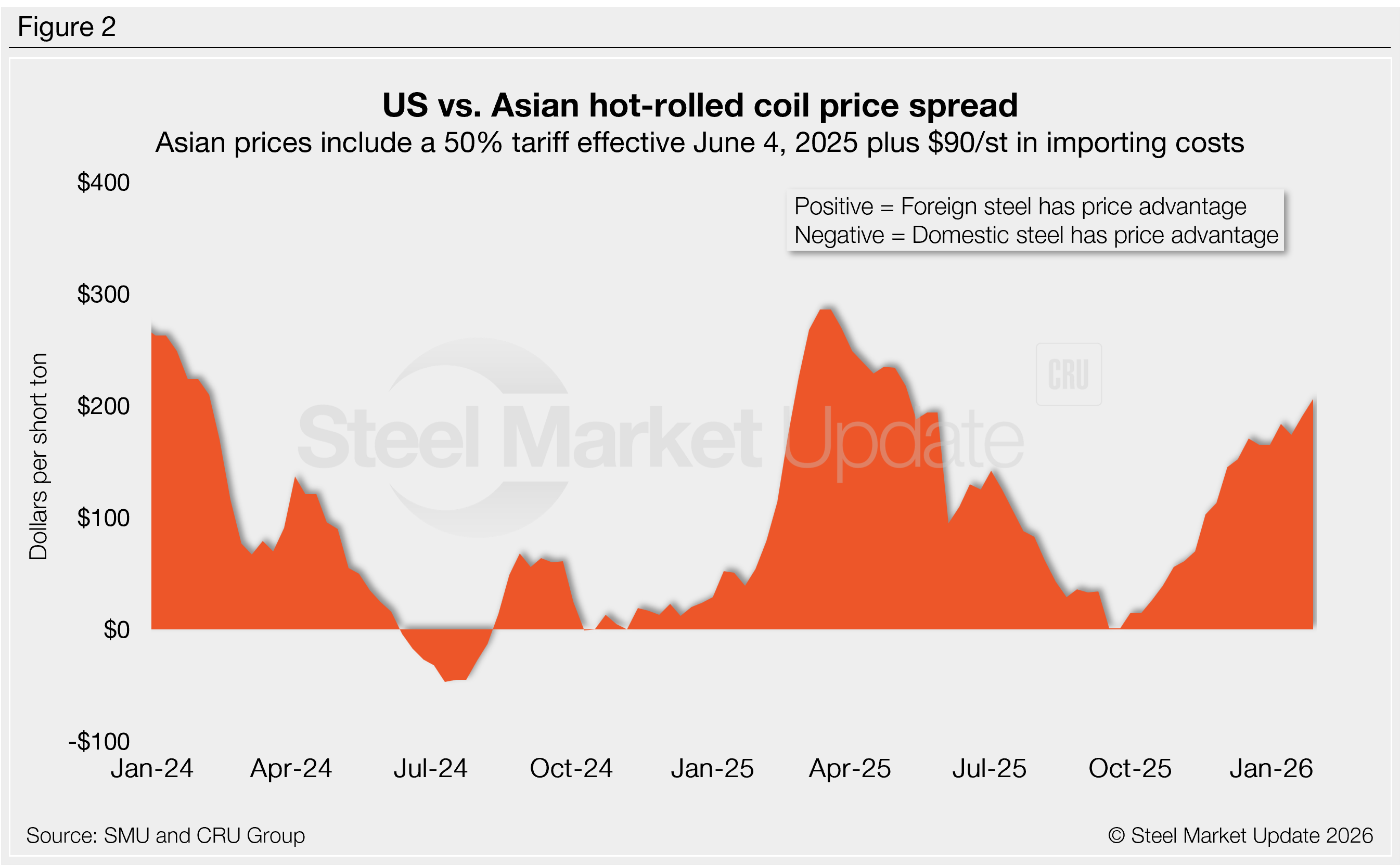 The result: Prices for US-produced HR are theoretically $206/st higher than steel imported from Asia — up ~$15/st w/w but just $22/st vs. last month.