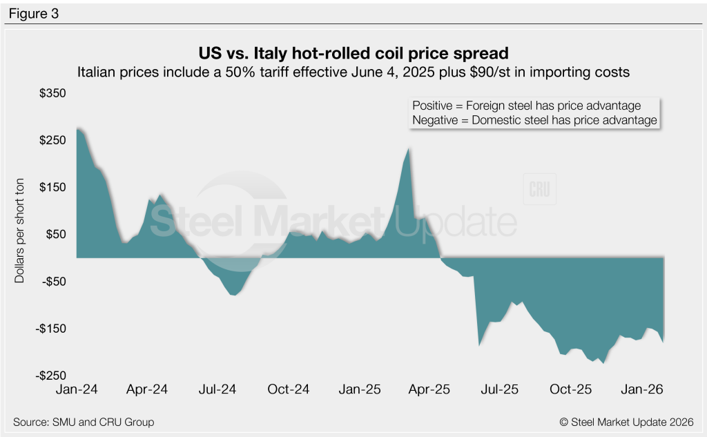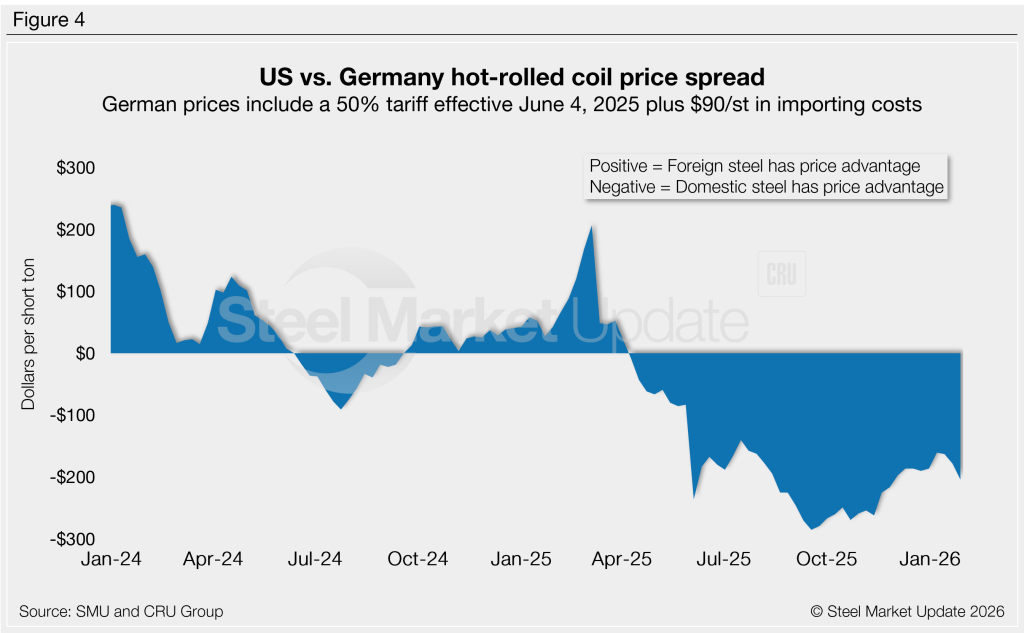 The difference maker remains the 50% Section 232 tariffs. While imports from Europe are more expensive than domestic material, Southeast Asian products remain at a discount. The dynamic has kept the overall gap tighter since the fourth quarter.