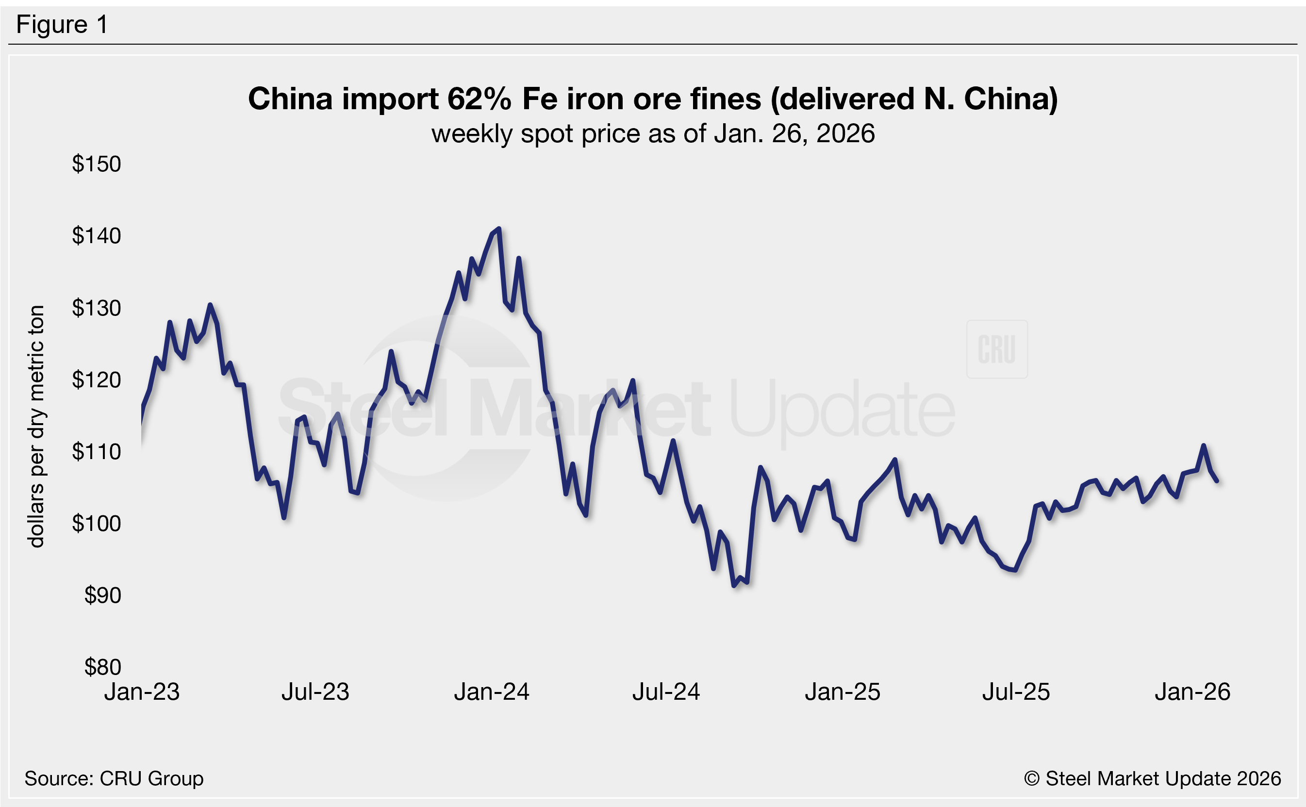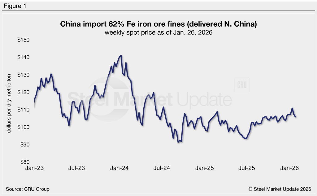 Chinese iron ore fines (62% Fe, delivered North China) have remained over $100 per dry metric ton (dmt) for over six months. Through the week of Jan. 26, prices have eased to a six-week low of $106/dmt, down 1% compared to month-earlier levels (Figure 1). Iron ore is now equal to prices seen three months ago and 2% higher than it was this time last year.
