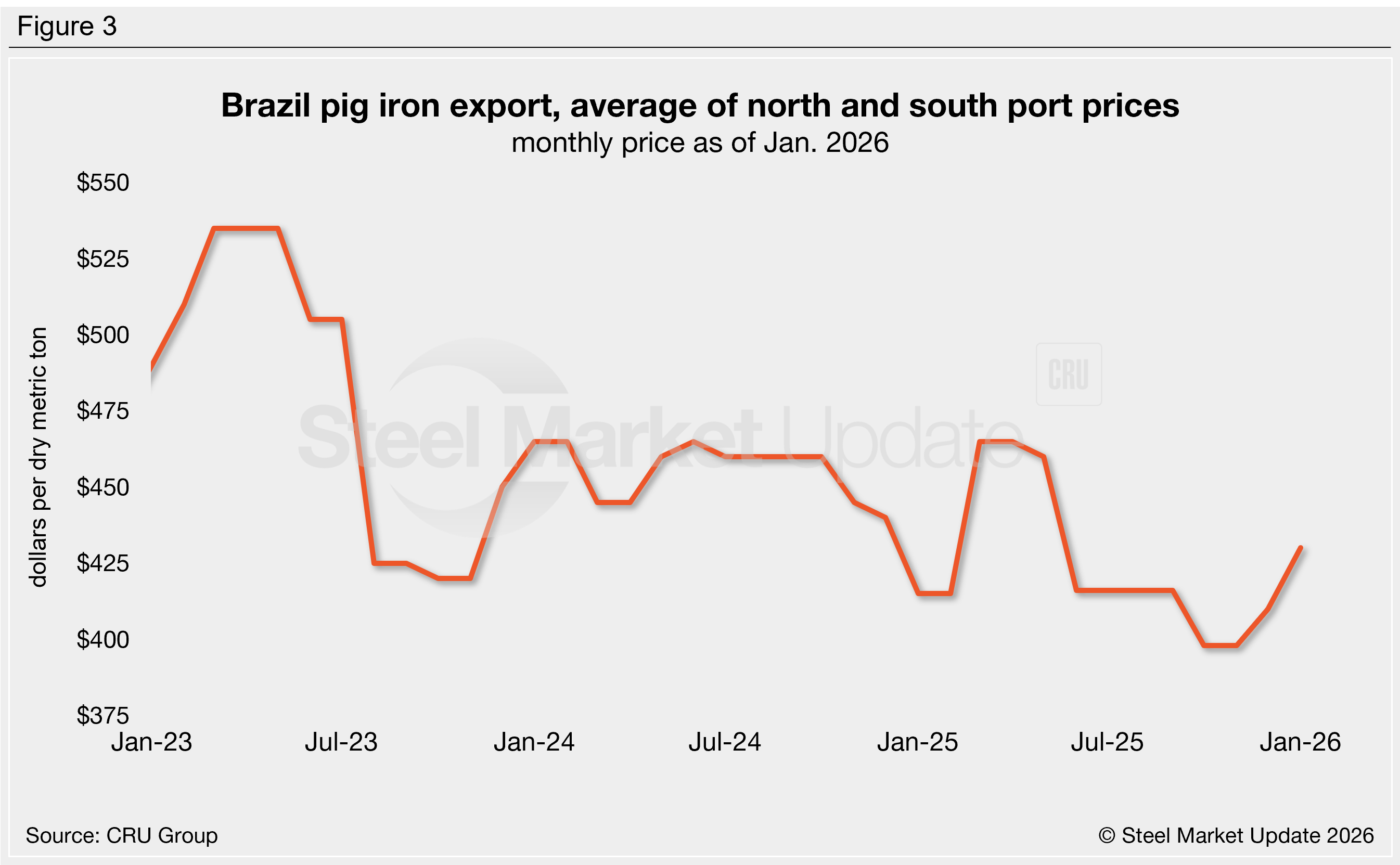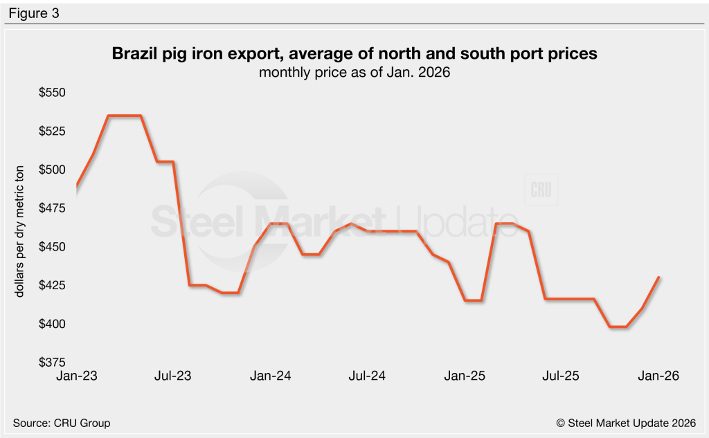 Brazilian pig iron prices increased 5% m/m in January to $430/dmt, the highest price recorded since May 2025 (Figure 3). Pig iron has risen 8% across the last three months and is 4% more expensive than it was one year ago. Prices are expected to rise again in February per a recent SMU article by Stephen Miller.