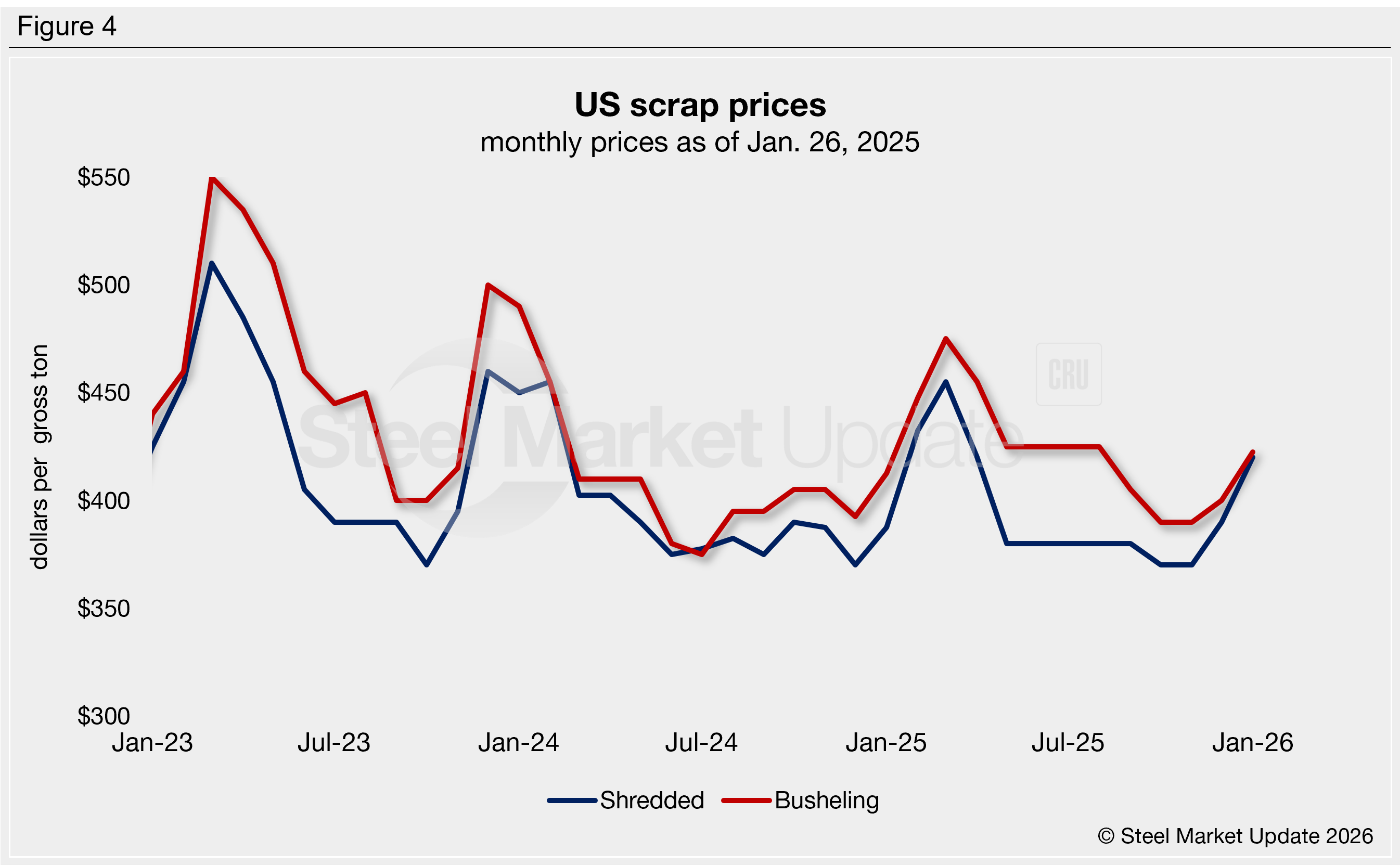 Steel scrap prices recovered for the second-consecutive month in January. SMU’s shredded scrap index rose to $420 per gross ton (gt) and our busheling index increased to $423/gt. Scrap prices are 8-14% higher than they were three months prior and 2-8% above those seen this time last year (Figure 4). As published earlier this week, many buyers expect scrap prices to increase further in February due to harsh winter weather and shipment disruptions.