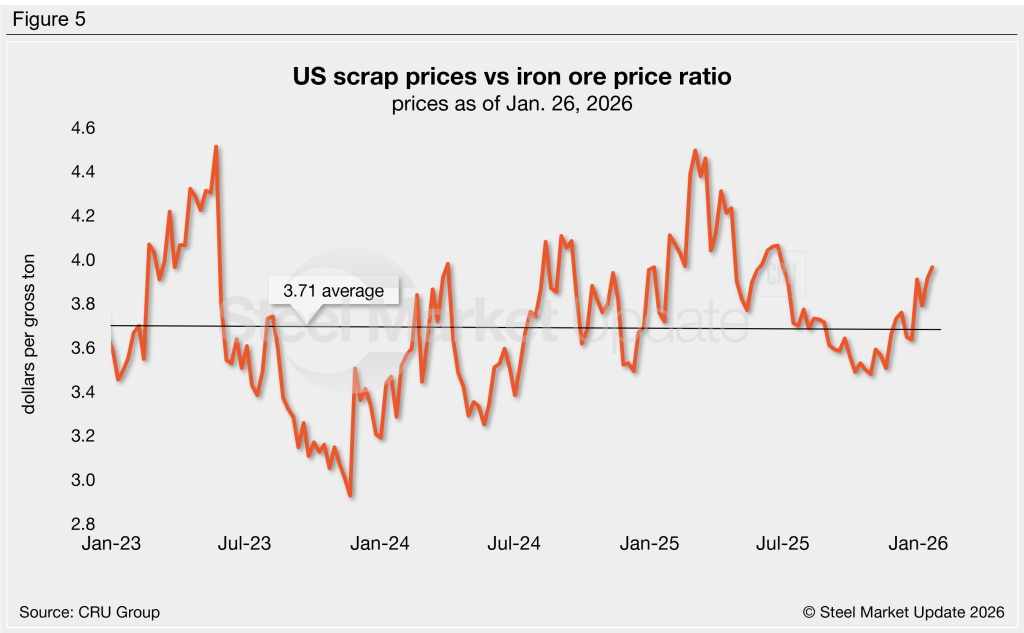 Fluctuations in scrap and iron ore prices provide insight into the competitiveness of integrated (blast furnace) mills, whose primary feedstock is iron ore vs. mini-mills (electric-arc furnace), whose primary feedstock is scrap. To compare these two mill materials, SMU divides the shredded scrap price by the iron ore price to calculate a ratio. A higher ratio favors integrated mills, a lower ratio favors mini-mill producers (Figure 5).