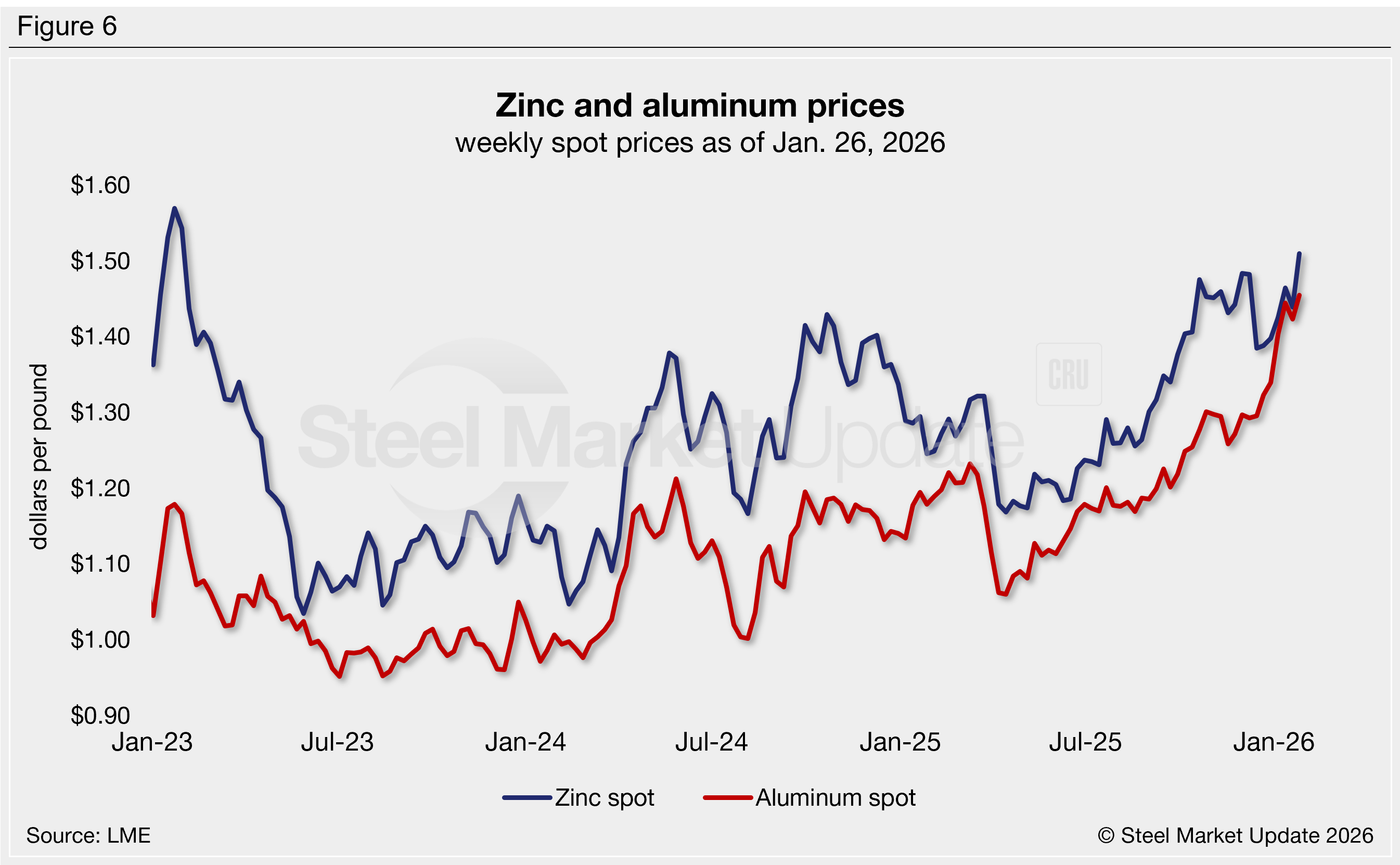 Zinc prices have trended upwards over the last eight months, reaching a near-three-year high of $1.51/lb as of Jan. 26. Prices have risen 4% over the past three months and are up 21% from this time last year (Figure 6).
