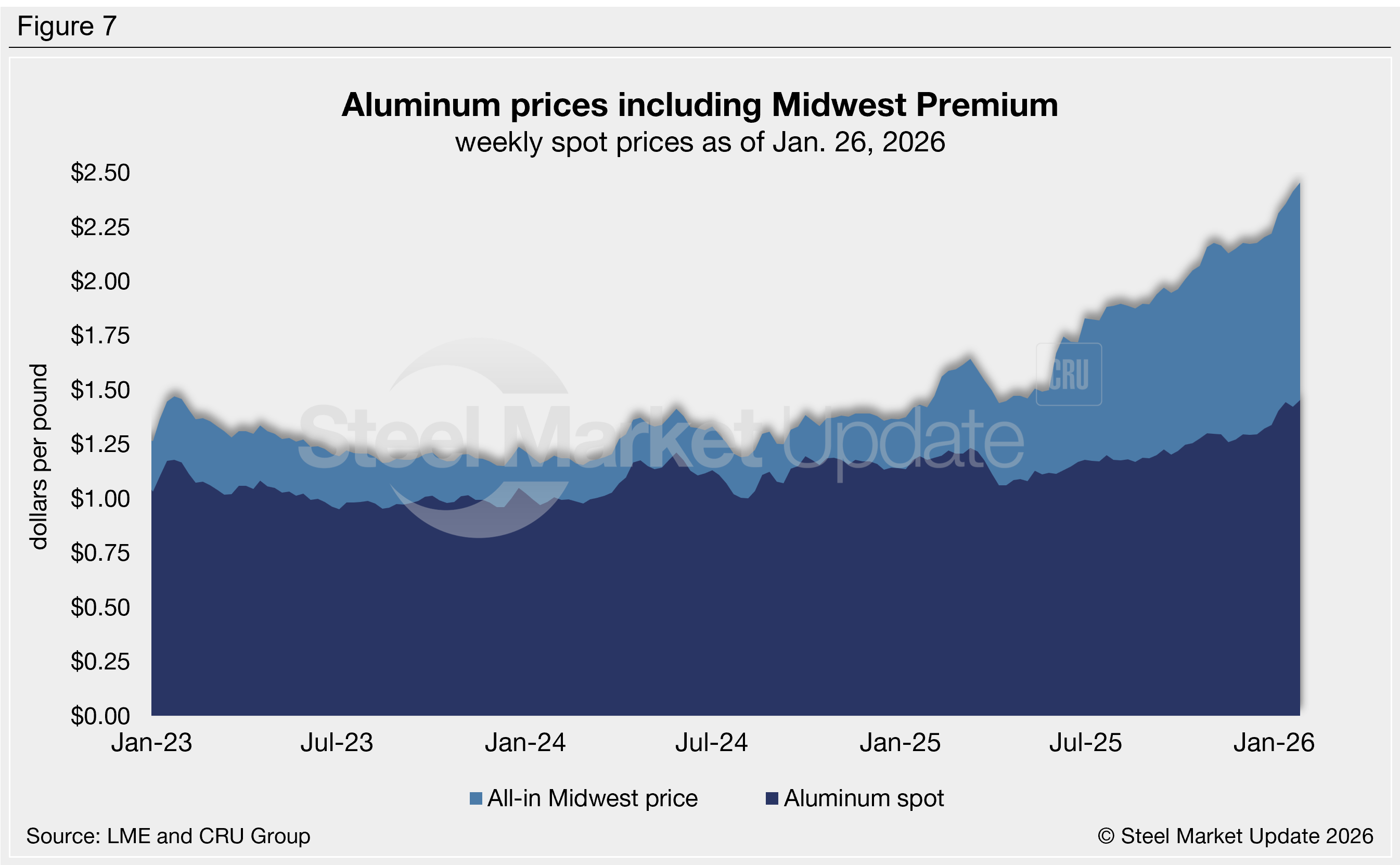 The weekly average aluminum MWP reached $1.00/lb this week, the highest rate recorded in our limited six-year data history. The MWP has increased 17% over the past three months and is up 314% from this time last year. The all-in Midwest aluminum price now totals $2.45/lb, the highest in our limited history (Figure 7).