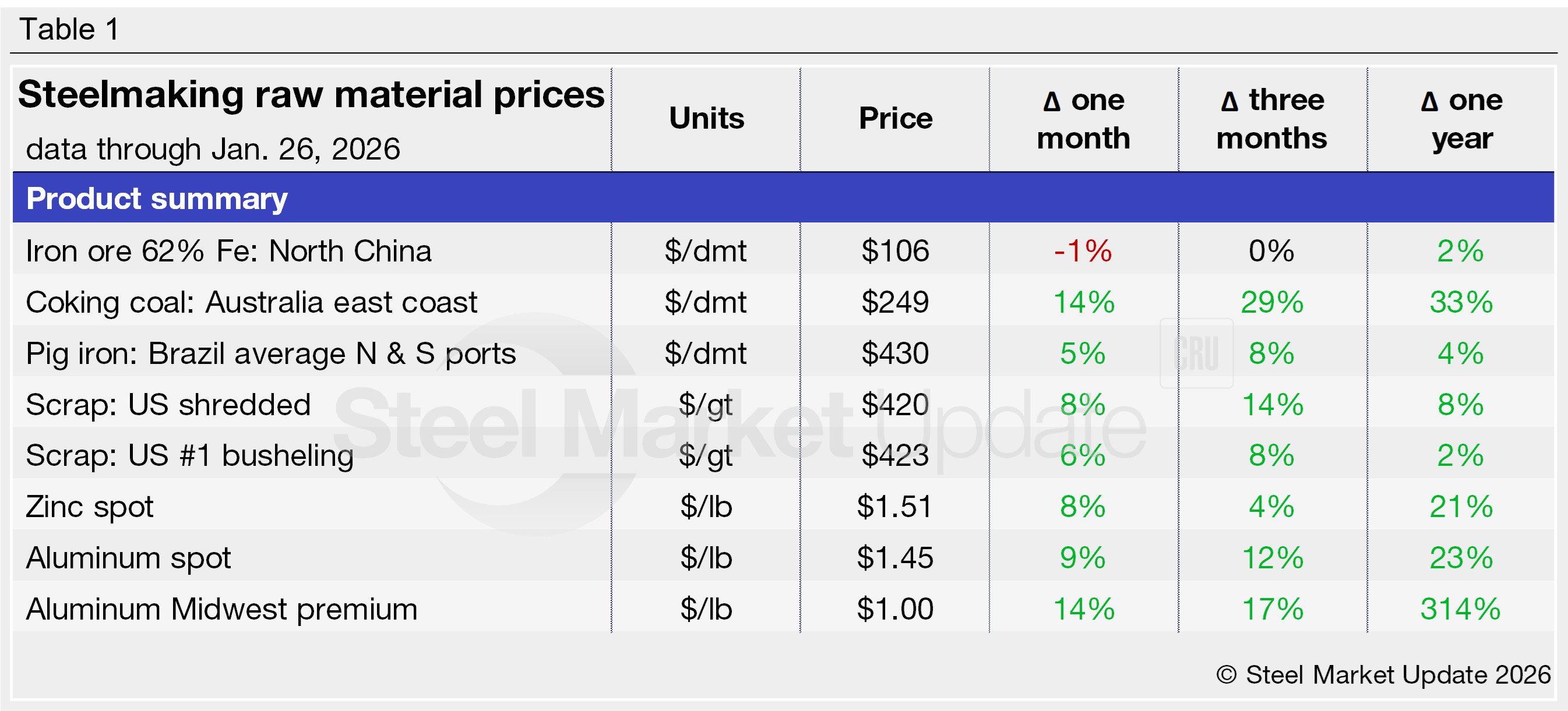 All but one of the steelmaking raw materials we track increased in price over the last month. Coking coal, pig iron, shredded scrap, busheling scrap, zinc, and aluminum prices have all risen in the last 30 days, while iron ore declined 1%. Collectively, prices rose 8% month over month (m/m). Seven of the eight products we track are more expensive than they were three months ago, and all are greater than levels recorded this time last year.
