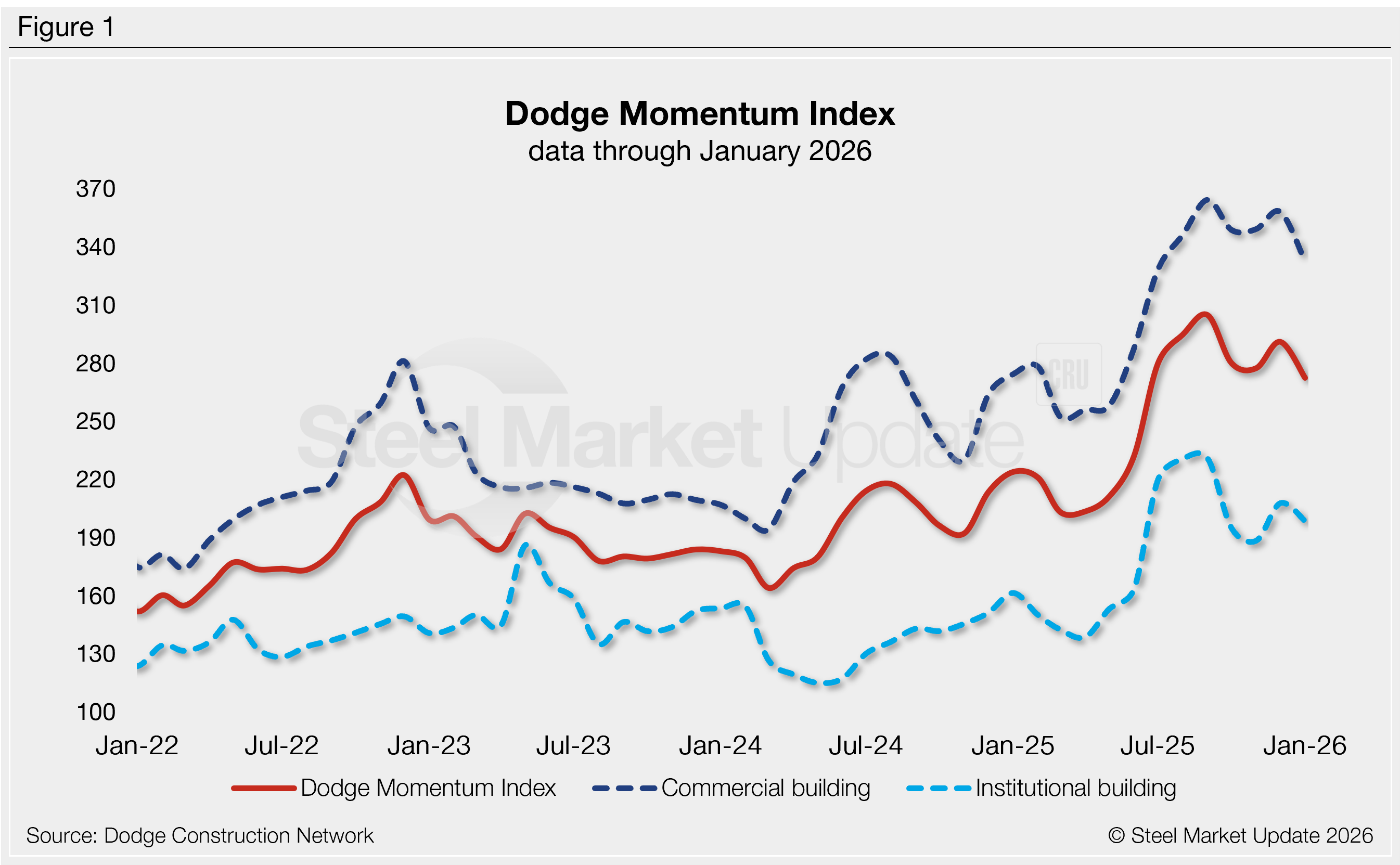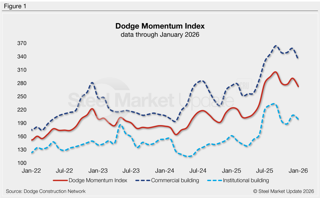 The Dodge Momentum Index (DMI) fell 6.2% in January to 272.7, retreating from December’s downwardly revised reading of 291.0, according to the latest data released by Dodge Construction Network.