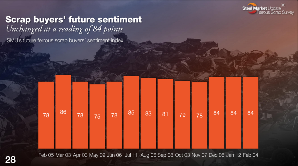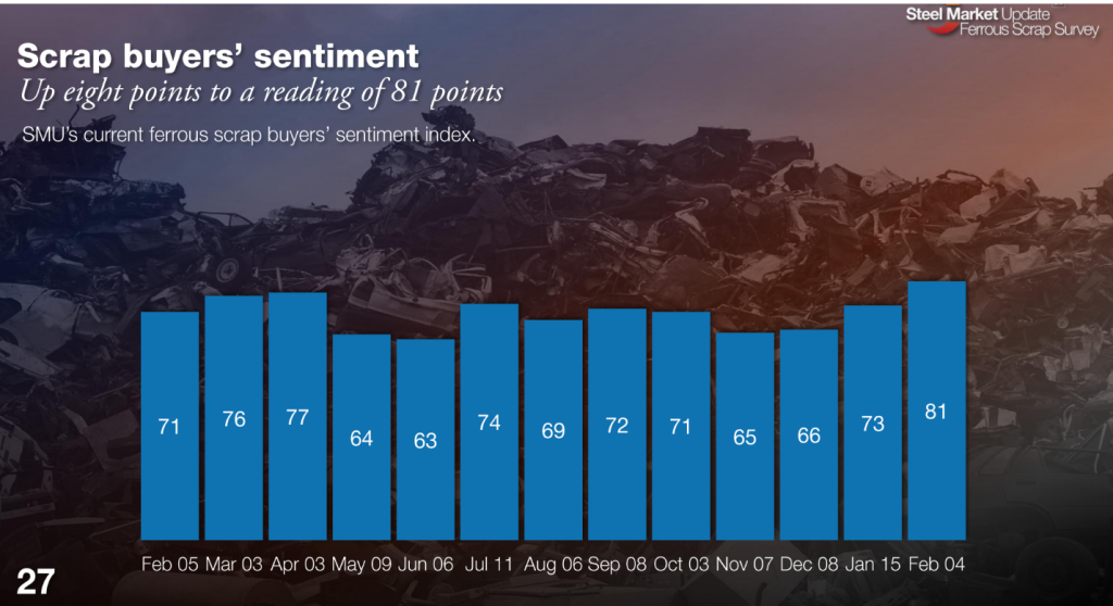 SMU’s Current Sentiment Index for scrap rose eight points from January to +81 in February. This is the highest sentiment level since we began the survey in February of last year.