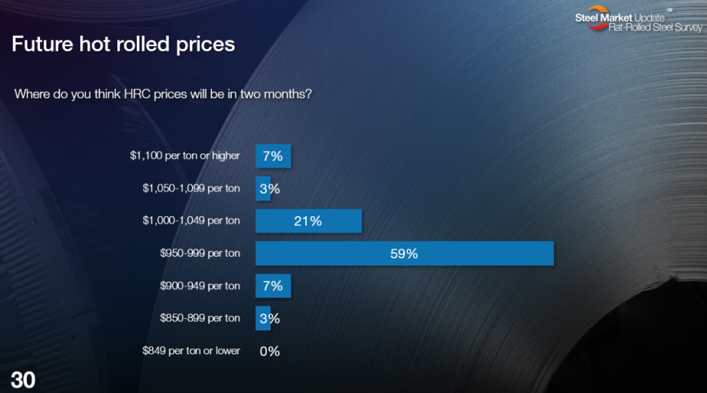 SMU’s HR price assessment stands at $965/st on average now. (We’ll assess prices again on Tuesday.) Most survey respondents (59%) think that prices will be in roughly the same ballpark two months from now. Only 10% see prices falling below $950/st on average. And nearly one-third (31%) see US HR prices starting out the quarter above $1,000/st.