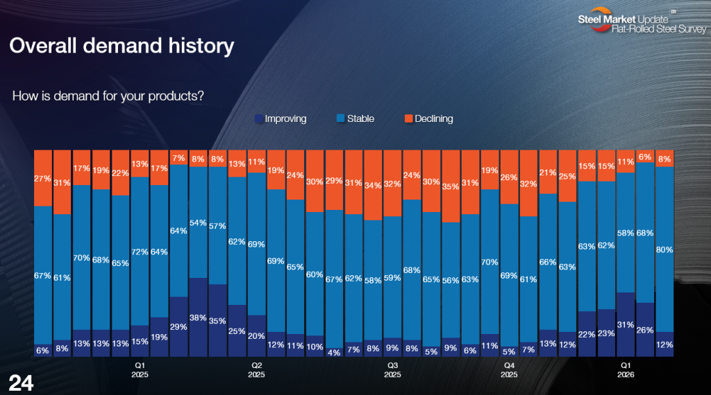 A quick note on format: I’m going to share a few slides from our most recent steel market survey. You can click on the slides to expand them. I’m also going to include comments from survey respondents (who always remain anonymous) in their own words.
