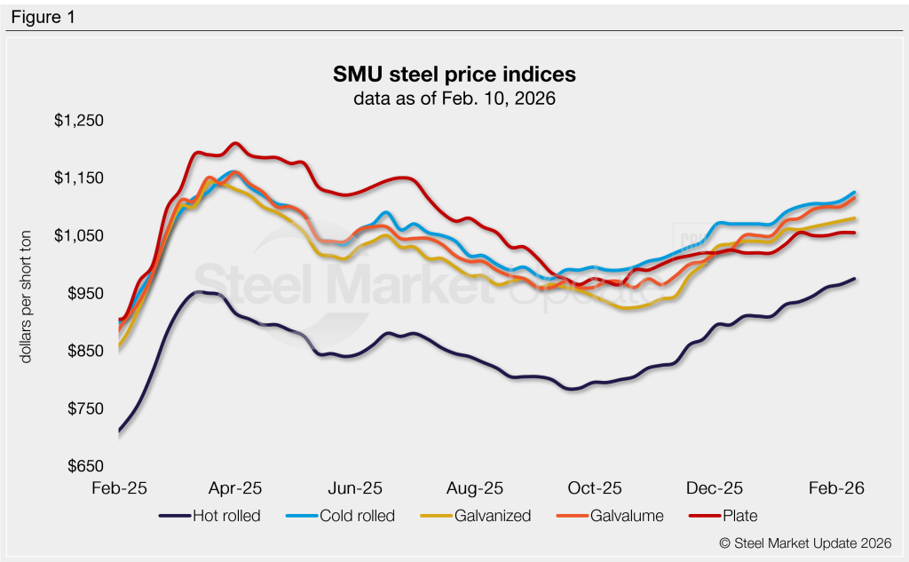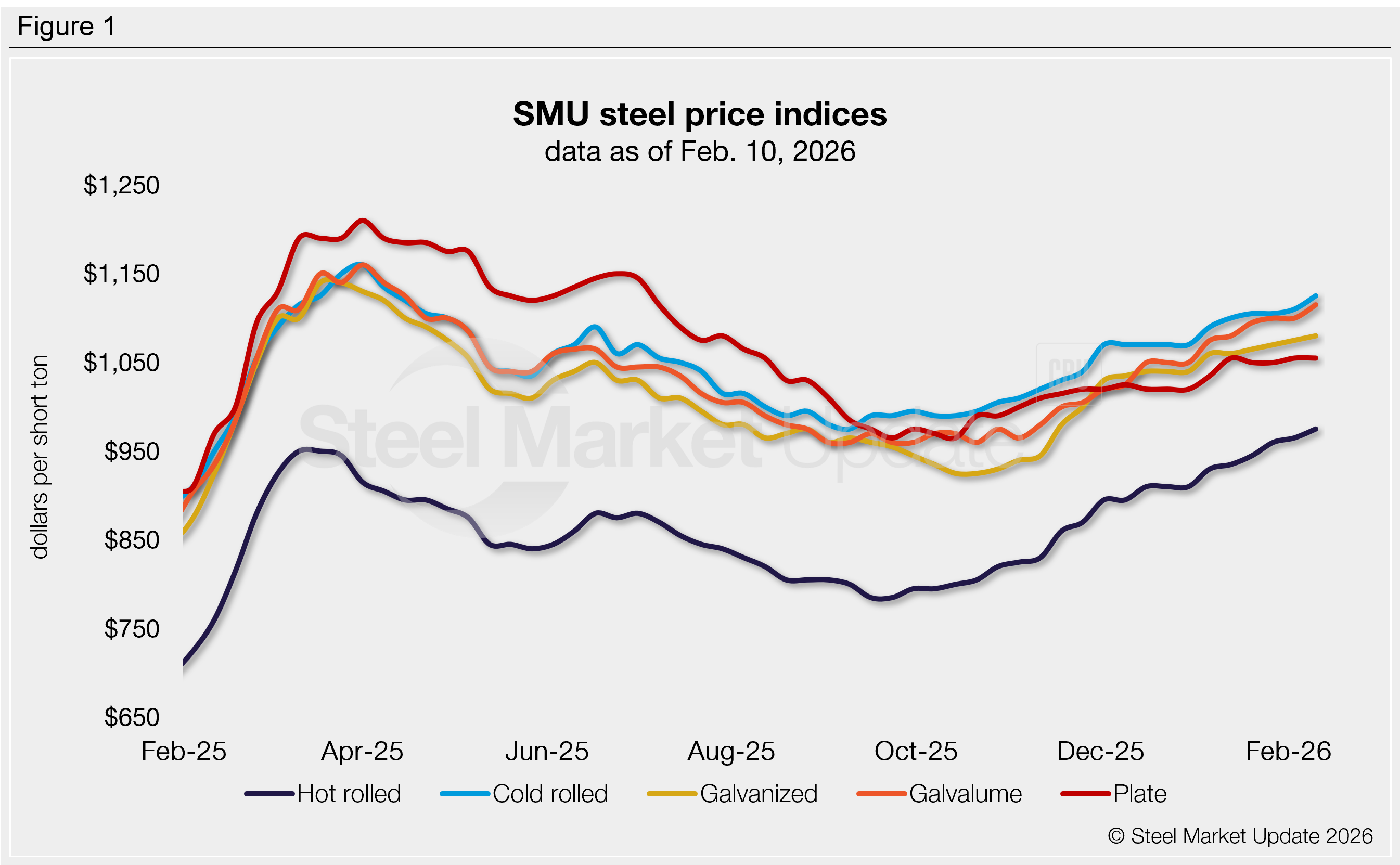 Hot-rolled lead times range from 5–7 weeks, averaging 5.9 weeks as of our Feb. 4 market survey.