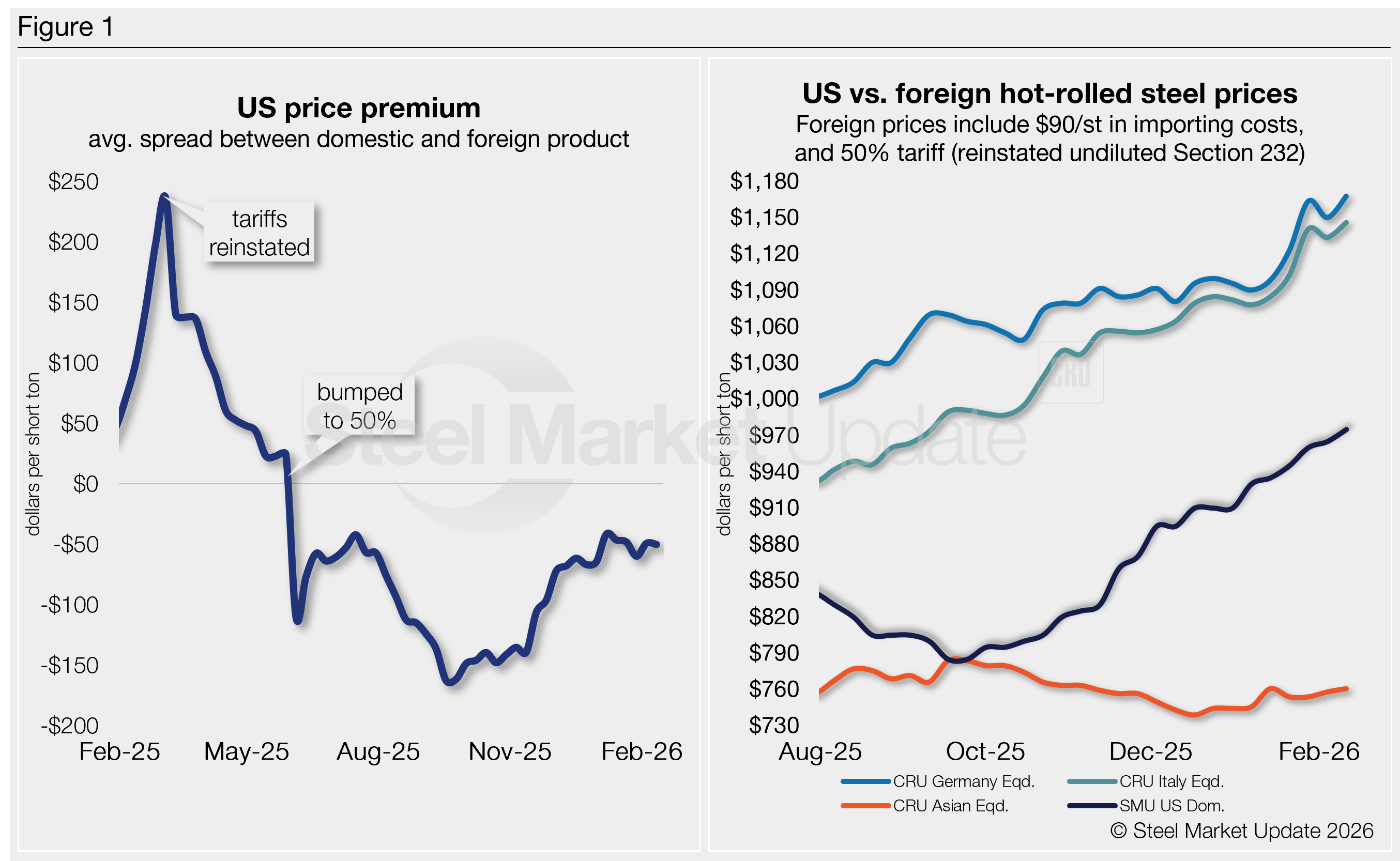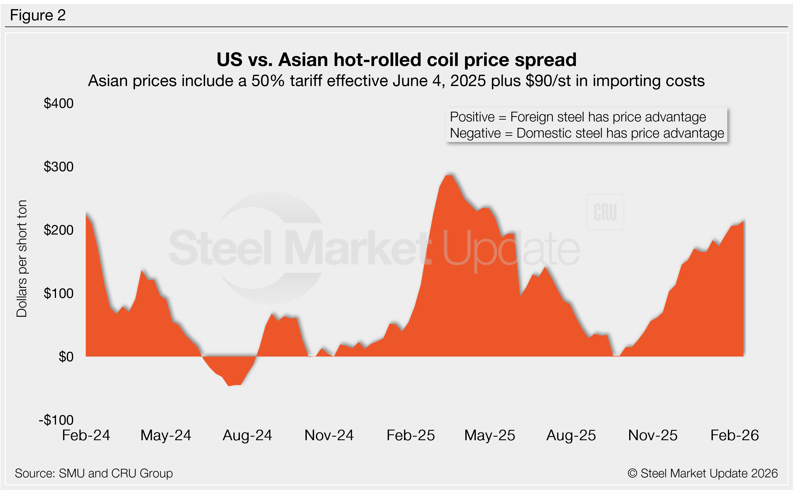 As of Wednesday, Feb. 11, the CRU Asian HRC price was $447/st, up $2/st w/w. Adding a 50% tariff and $90/st in estimated import costs, the delivered price of Asian hot band to the US is ~$761/st. As noted above, the latest SMU US HR price is $975/st on average.