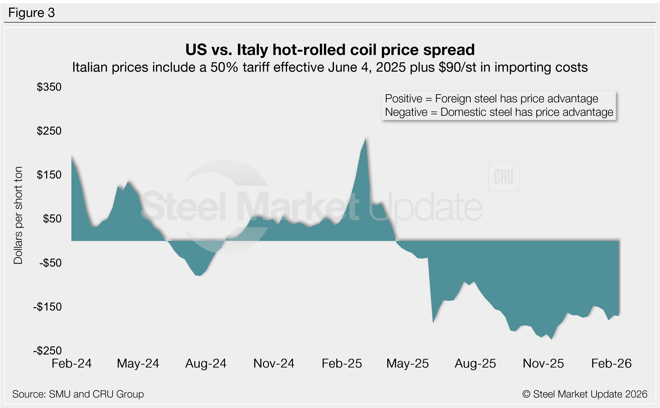 The difference maker remains the 50% Section 232 tariffs. While imports from Europe are more expensive than domestic material, Southeast Asian products remain at a discount. The dynamic has kept the overall gap tighter since the fourth quarter.