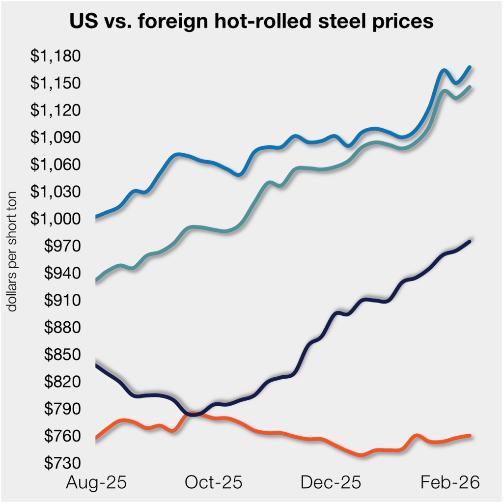The result: Prices for US-produced HR are theoretically $214/st higher than steel imported from Asia — up ~$7/st w/w but up just $5/st vs. last month.