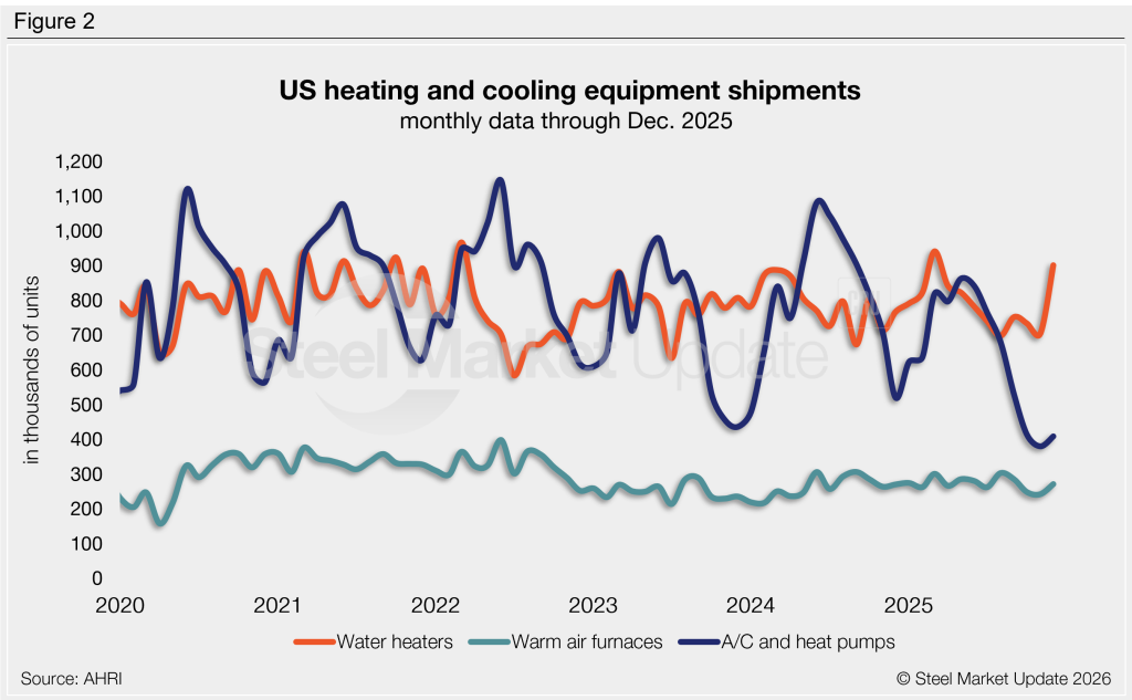 December shipments recovered to a four-month high of 1.58 million units, 2% higher than the same month one year prior (Figure 1, left). Shipments of water heaters, warm-air furnaces, and air conditioners/heat pumps all increased month over month (m/m), an across-the-board rise not seen since March 2025.