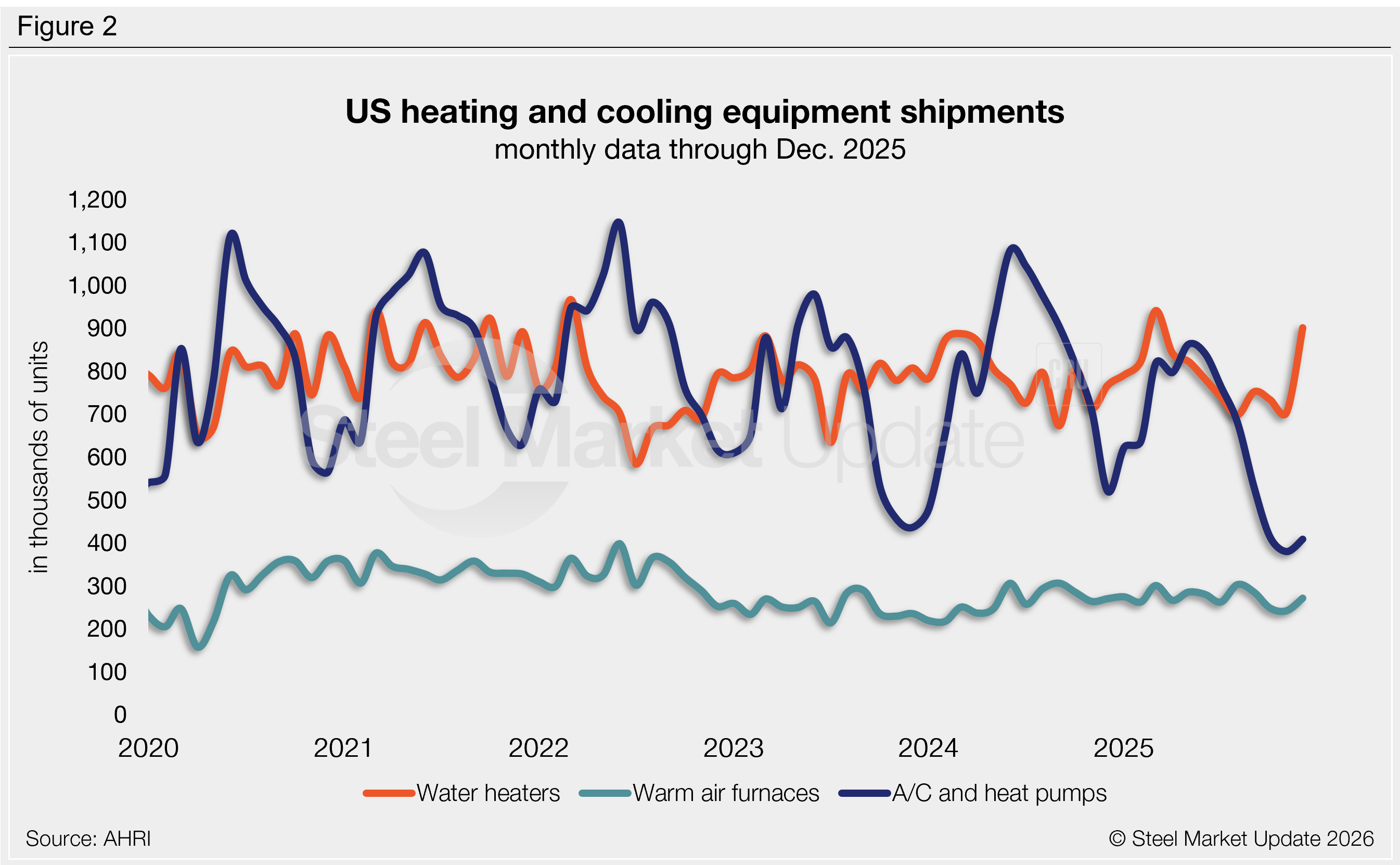 - Shipments of water heaters jumped 28% m/m in December to a nine-month high of 901,000 units, up 17% year over year (y/y).