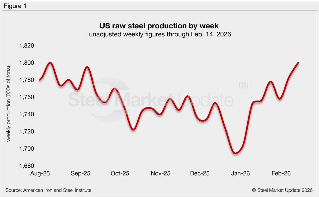 US mills produced an estimated 1,800,000 short tons (st) of raw steel in the week ending Feb. 14, up 17,000 st, or 1.0%, from the prior week (Figure 1). This is tied with one other week (mid-August 2025) for the highest unadjusted weekly production rate recorded since January 2022.