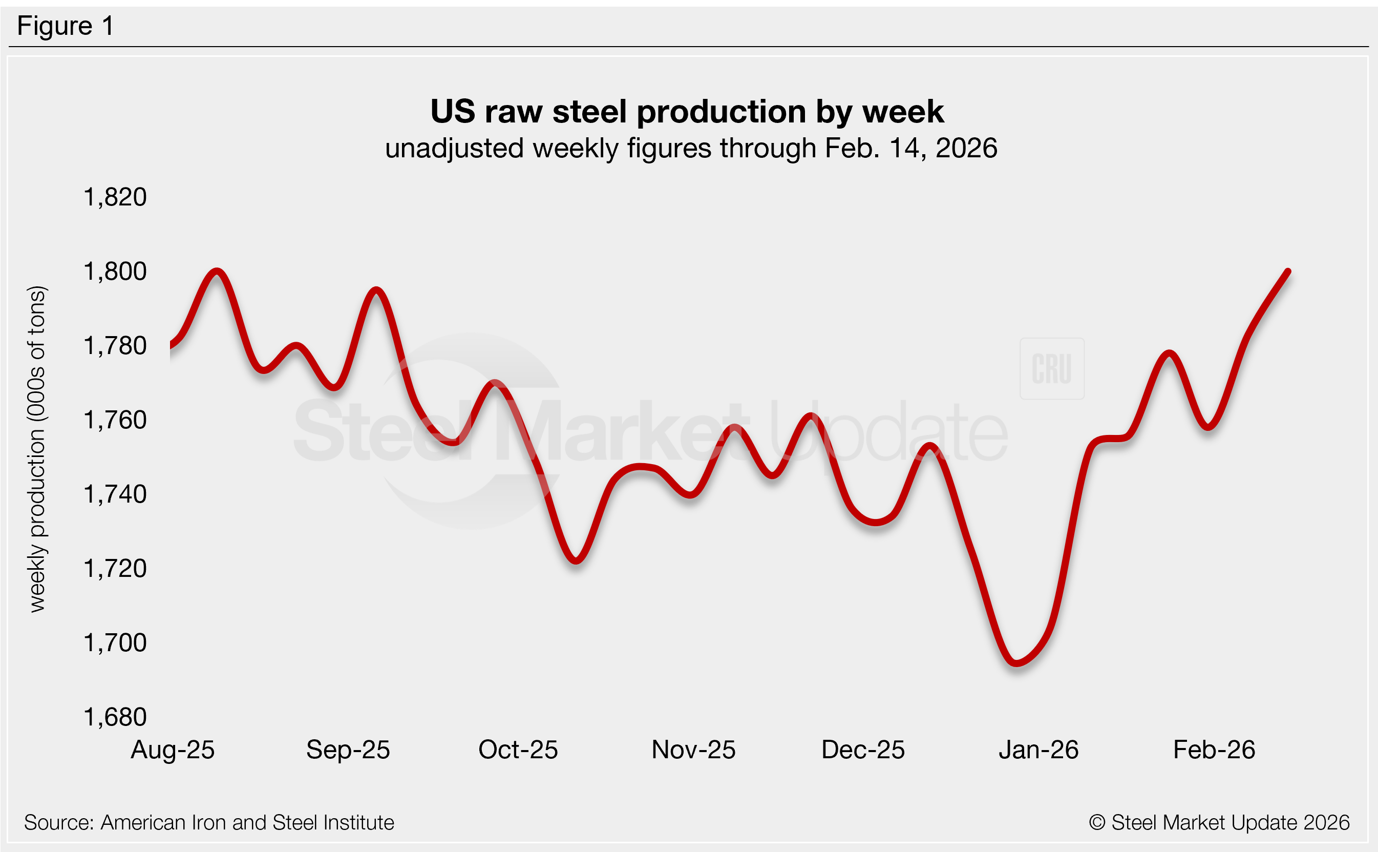 US mills produced an estimated 1,800,000 short tons (st) of raw steel in the week ending Feb. 14, up 17,000 st, or 1.0%, from the prior week (Figure 1). This is tied with one other week (mid-August 2025) for the highest unadjusted weekly production rate recorded since January 2022.