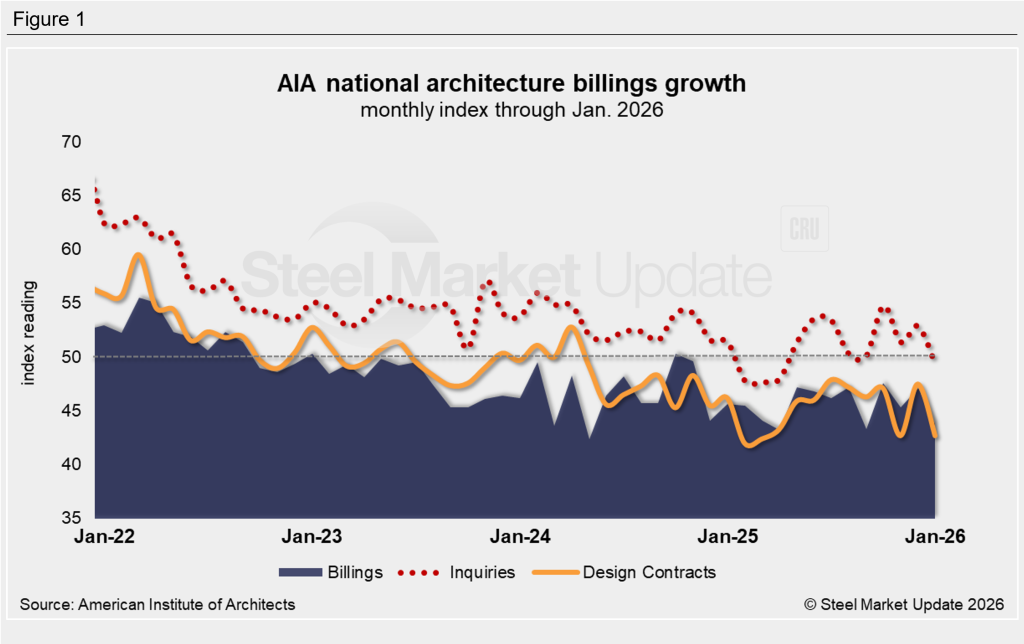 January’s reading of 43.8 was down from 47.1 in December, the American Institute of Architects (AIA) reported.