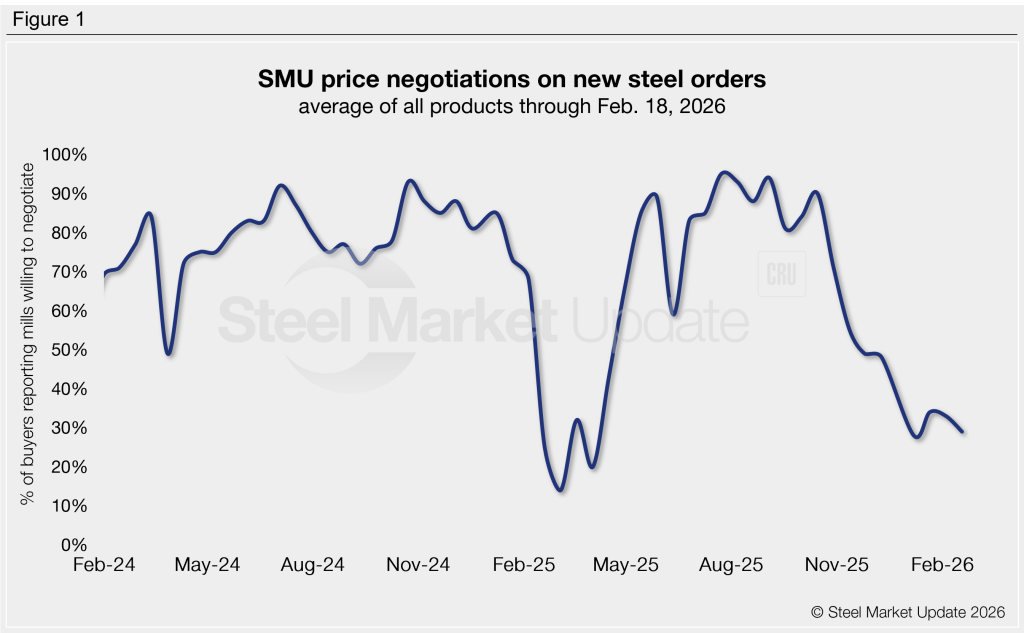 Just one of every four steel buyers who responded to our market survey this week said domestic mills are negotiable on new spot order pricing. Since late 2025, mills have begun to hold a firmer stance on prices, tightening their grip at the start of this year and holding on since.