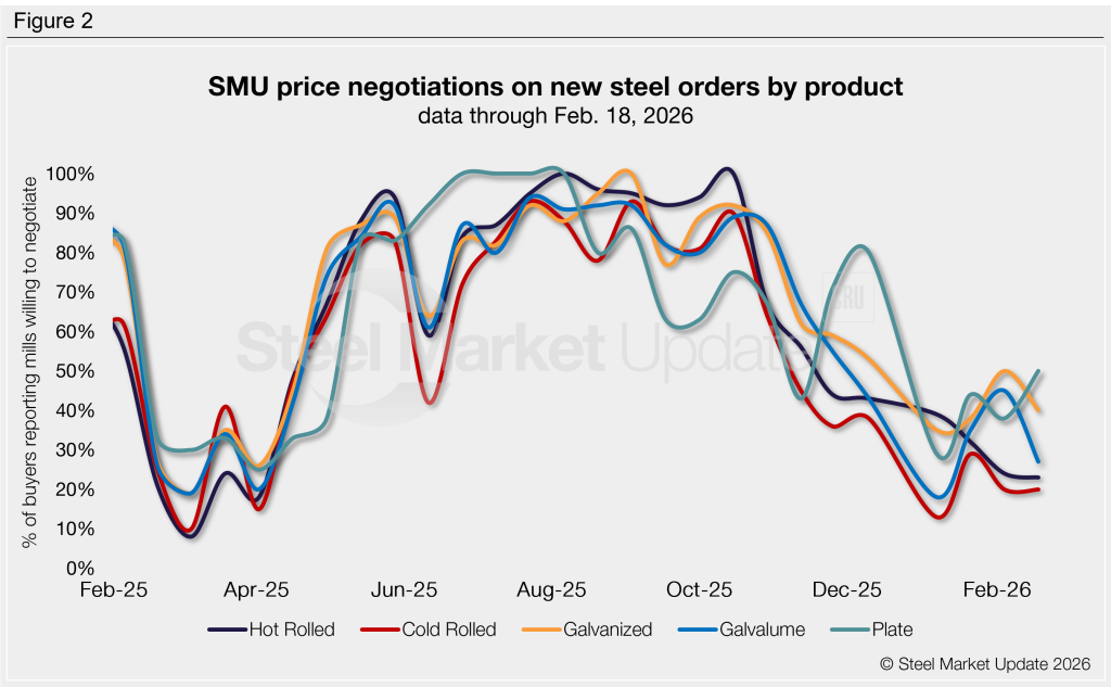 - Hot rolled: 23% of buyers said mills are negotiable on price. This is down one percentage point from early-February and now the lowest rate recorded since April 2025.