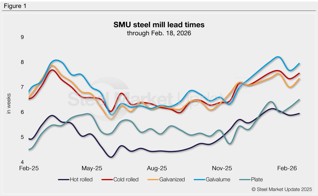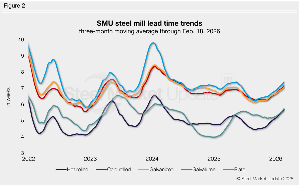 Steel mill lead times marginally extended on both sheet and plate products this week, according to buyers responding to our latest market survey. Hot rolled and galvanized lead times are about half a week longer than they were three months ago, while production times for cold rolled, Galvalume, and plate products are one to two weeks longer.