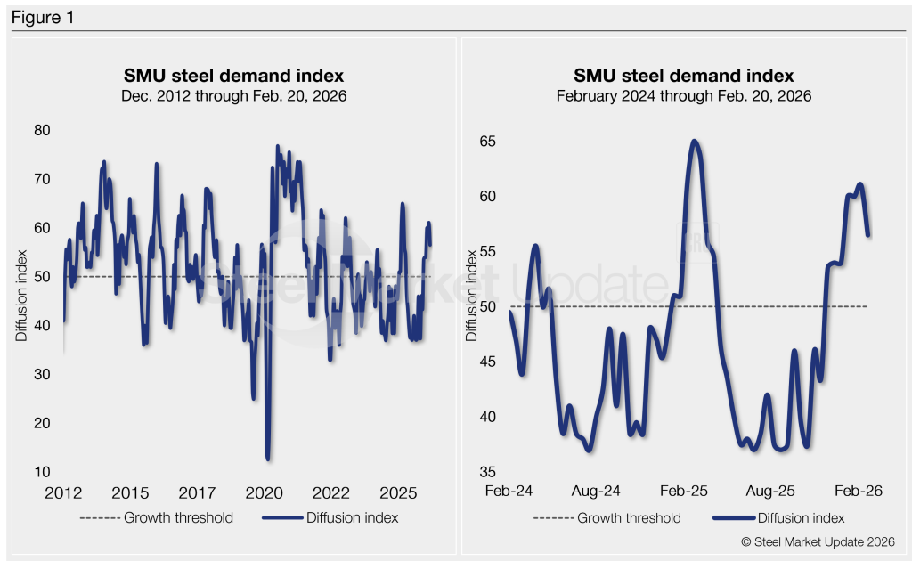 SMU’s Steel Demand Index slipped from earlier in the month, but remains above expansion territory, according to late-February indicators.