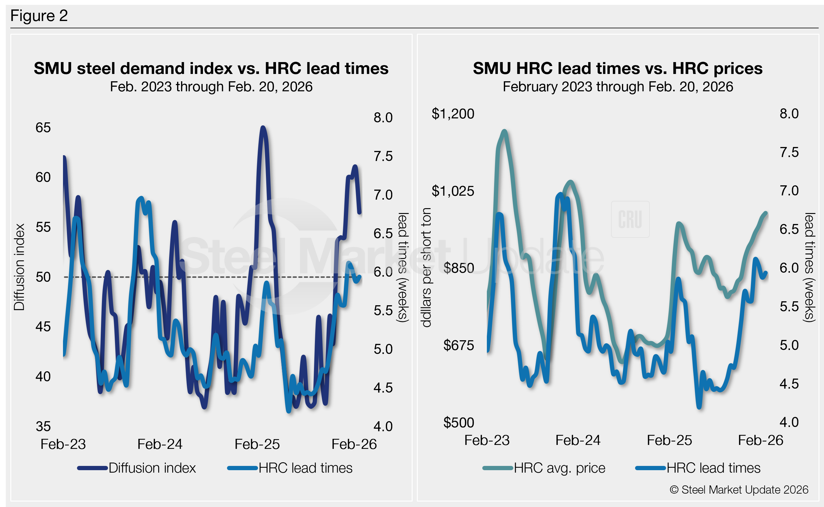 For nearly a decade, SMU’s steel demand diffusion index has preceded moves in mill lead times (Figure 2, left side), and SMU’s lead times have also been a leading indicator of flat-rolled steel prices, particularly for HRC (Figure 2, right side).