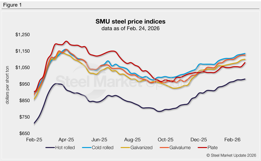 Coated prices are at high levels not seen since April 2025. Galvanized rose $5/st this week to $1,100/st, while Galvalume held steady at $1,125/st.