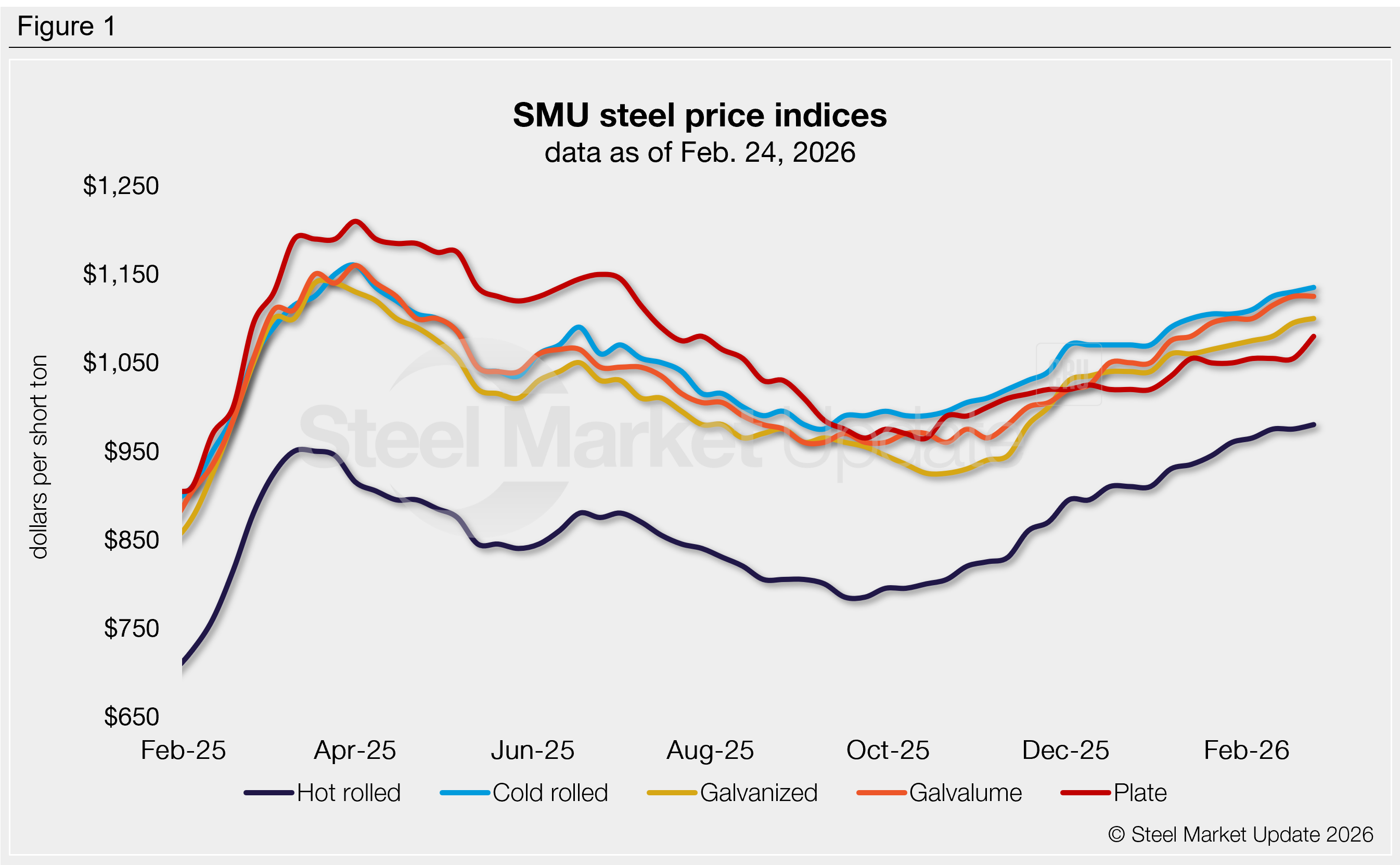 Coated prices are at high levels not seen since April 2025. Galvanized rose $5/st this week to $1,100/st, while Galvalume held steady at $1,125/st.