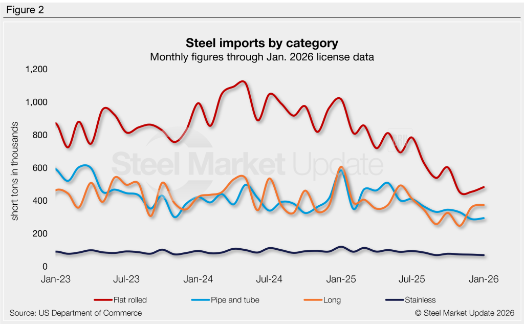 The total volume of steel products that entered the country in December was 1.58 million short tons (st). This is the second-lowest monthly import rate recorded since 2020, just 19,000 st above the multi-year low set in September. The latest license data shows 1.57 million st of material was imported in January.