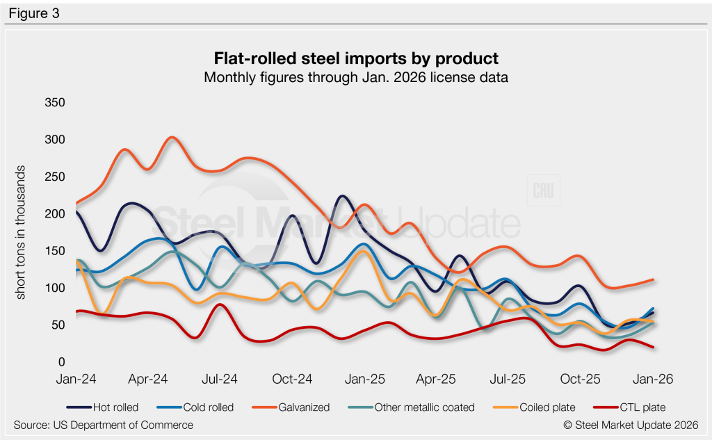Figure 3 tracks flat-rolled imports for six popular sheet products. Many products saw improving trade levels in December and January following the multi-year lows set in November. Key highlights: