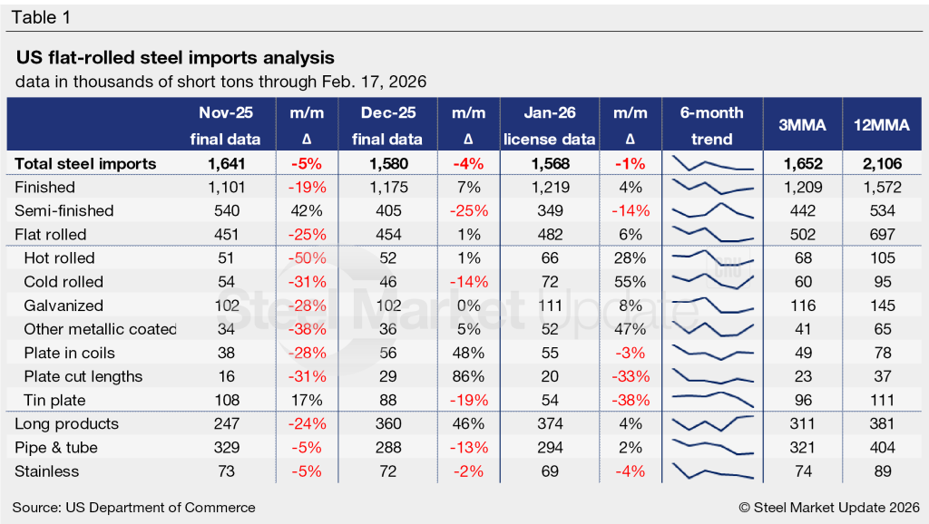 Table 1 highlights high-volume steel product imports (click to expand). Note that the 3MMA and 12MMA columns are calculated through final December data and do not include January or licenses. For deeper analysis, visit our Steel Imports page.