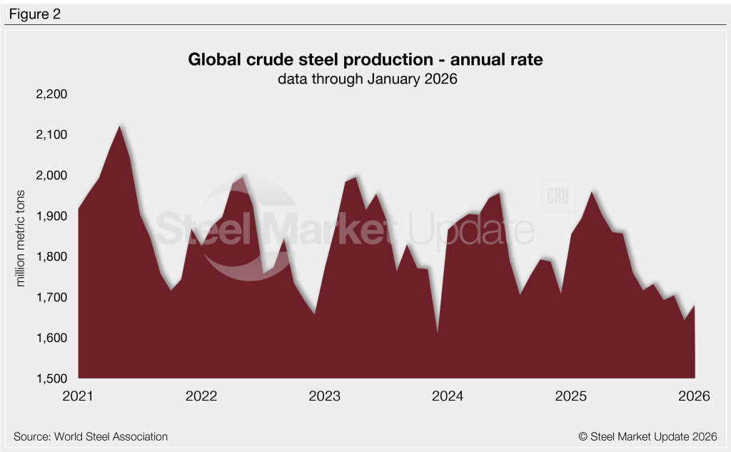 January’s daily production rate was 4.60 million mt, up 2.2% but still the second-lowest total since December 2023. Over the last year, daily production was as high as 5.37 million mt in March. At January’s rate, annualized global production would total approximately 1.68 billion mt (see Figure 2), one of the lower rates recorded in recent years.