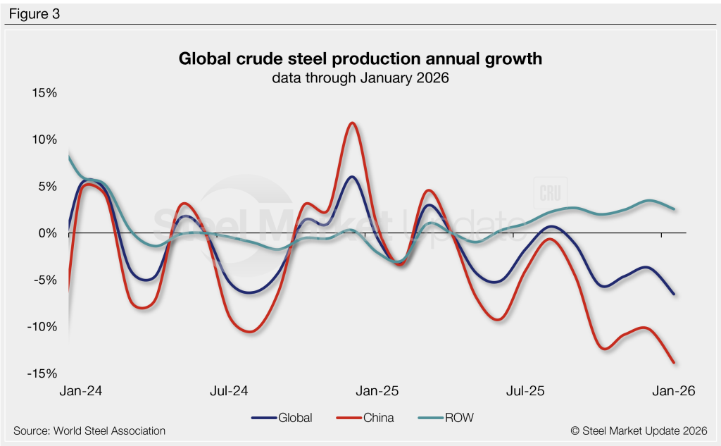 Steel production is highly seasonal, with output typically strongest in the spring months and weaker in the second half of the year. Annual comparisons can help see past seasonal variations. Figure 3 shows the year-over-year (y/y) growth rates for total global production and for China and the rest of the world (ROW) combined.