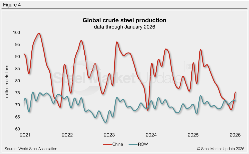 ROW steel output rose 0.8% to 72 million mt in January, the second-best total in the past 12 months, only behind 73.7 million mt produced last March. ROW production has averaged 70.3 million mt per month over the past year.