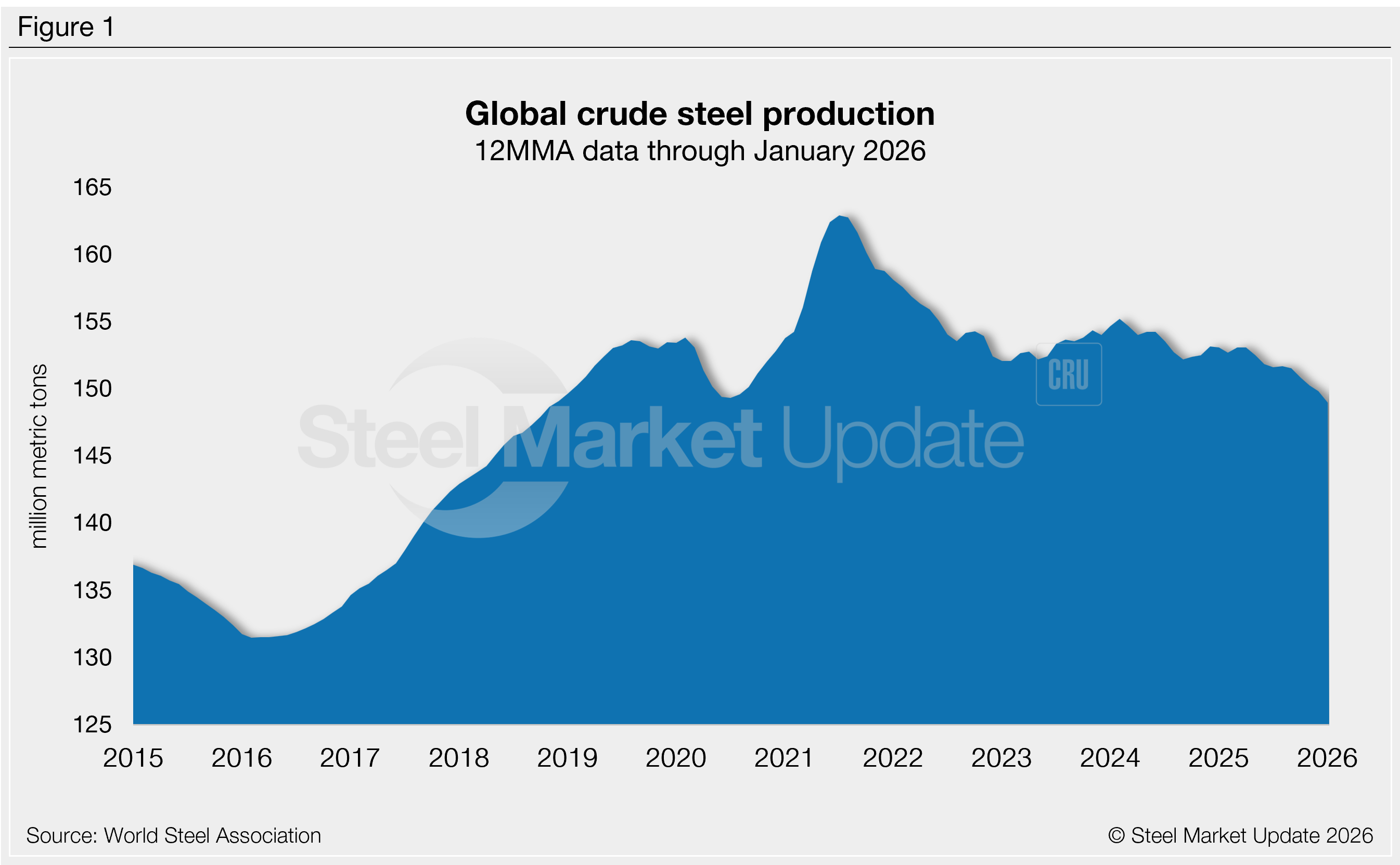 On a 12-month moving average (12MMA) basis through January, annual production has averaged 148.9 million mt per month over the last year, down 2.7% from the same period one year prior (see Figure 1). Up until September, annual output had generally hovered between 152 million and 154 million mt for nearly three years, similar to pre-pandemic levels.