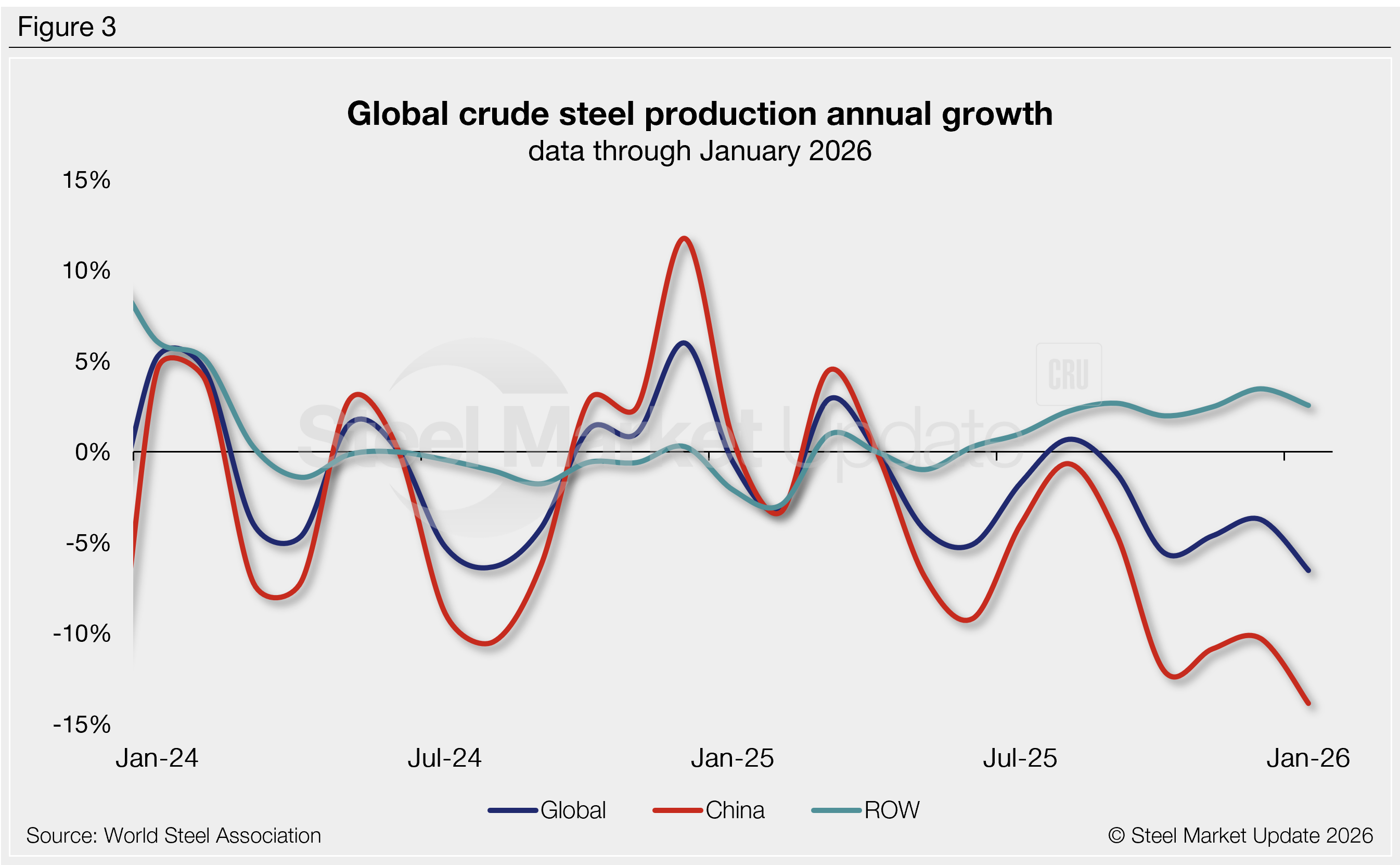 Steel production is highly seasonal, with output typically strongest in the spring months and weaker in the second half of the year. Annual comparisons can help see past seasonal variations. Figure 3 shows the year-over-year (y/y) growth rates for total global production and for China and the rest of the world (ROW) combined.