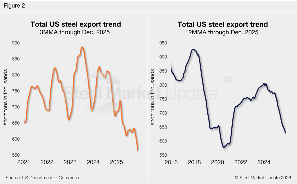 The volume of steel shipped outside of the country totaled 469,000 st in December, the lowest measure seen since June 2020. Exports have trended lower since late 2024. December trade was 25% below the average export rate seen across the previous year (629,000 st per month), and 23% less than the same month of 2024.