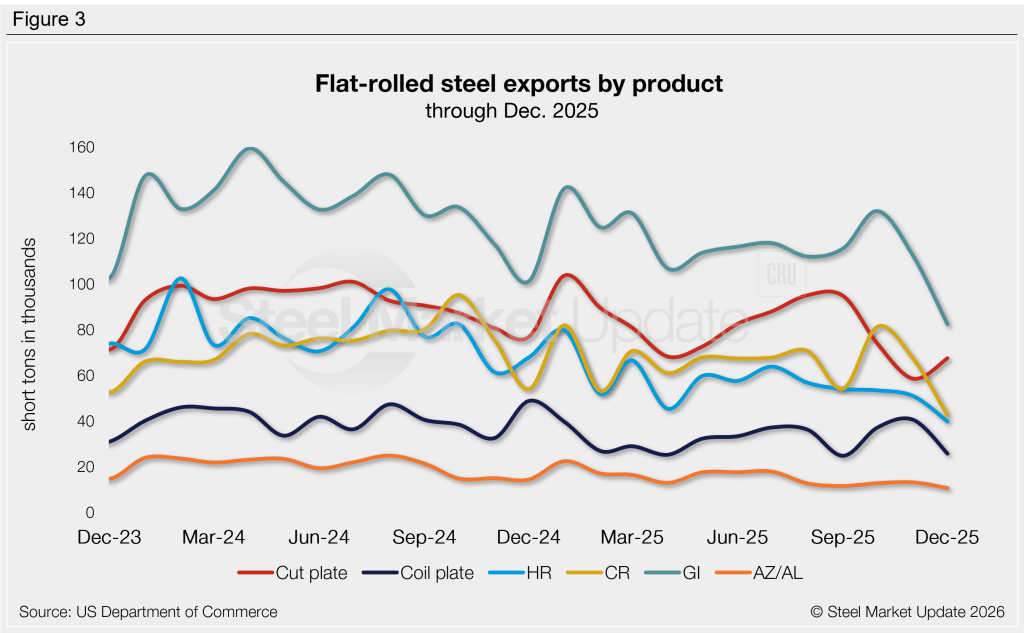- Coiled plate exports declined 36%, just 1,000 st above the three-year low set in September.