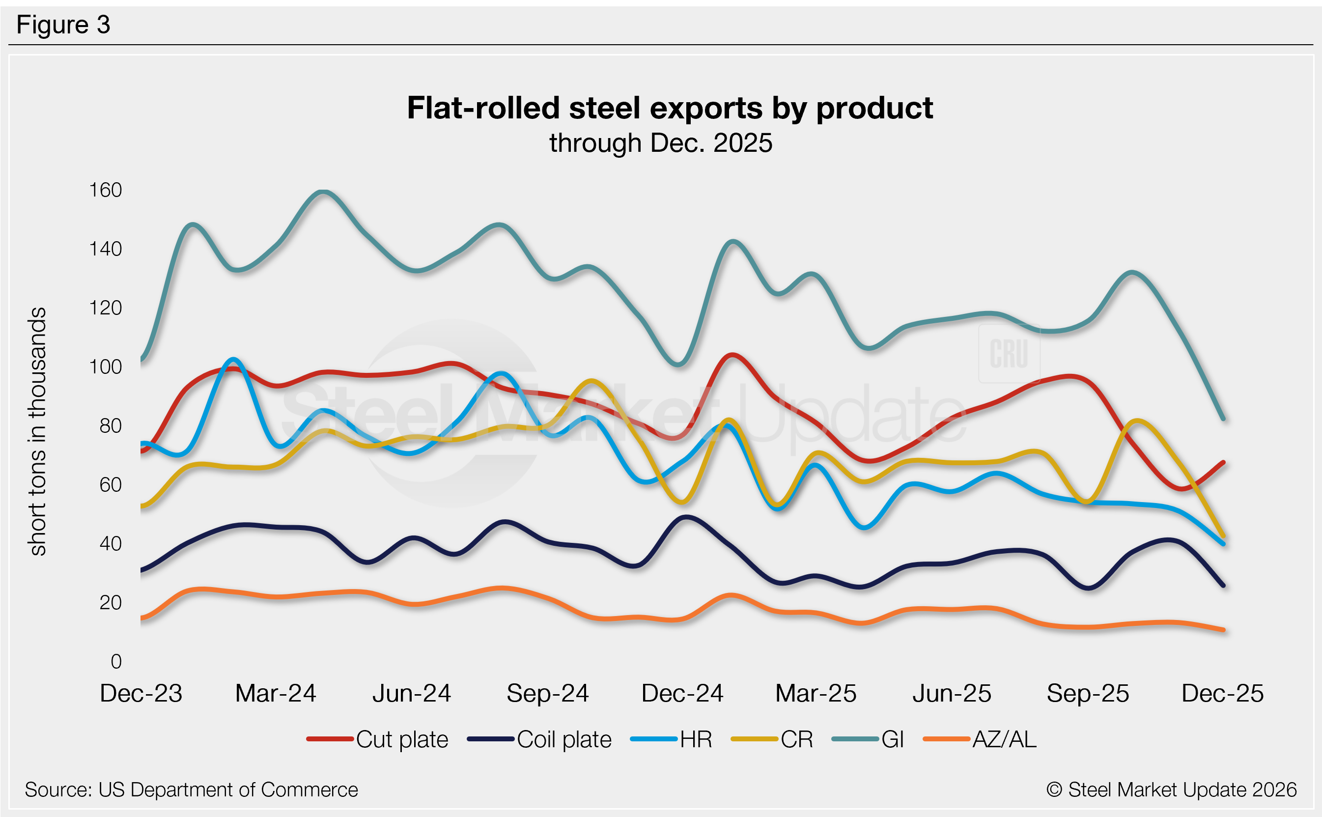 - Cold-rolled exports fell 37% to a three-year low.