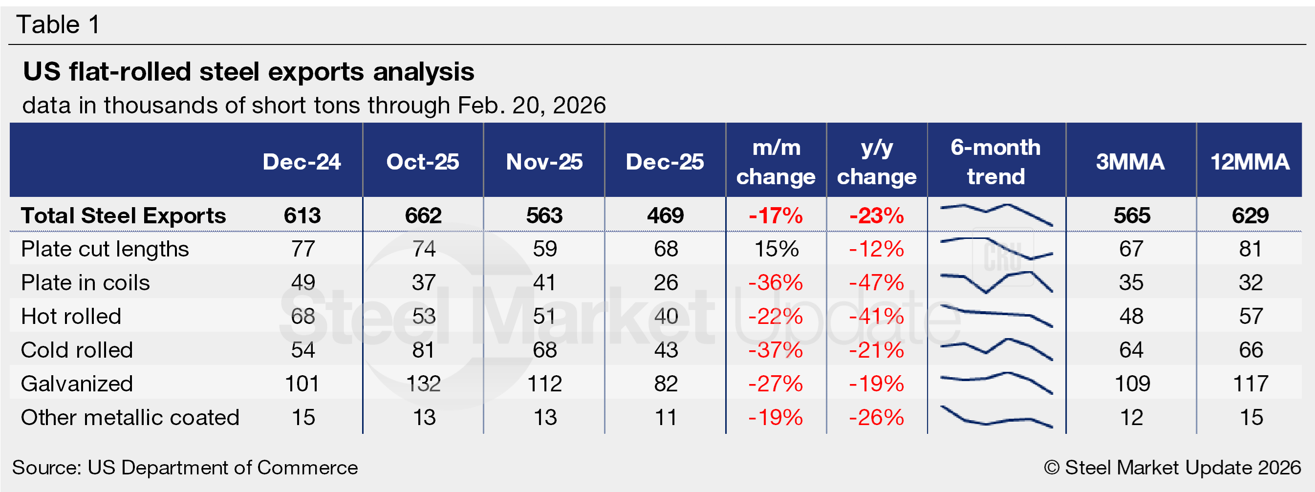 The volume of steel shipped outside of the country totaled 469,000 st in December, the lowest measure seen since June 2020. Exports have trended lower since late 2024. December trade was 25% below the average export rate seen across the previous year (629,000 st per month), and 23% less than the same month of 2024.