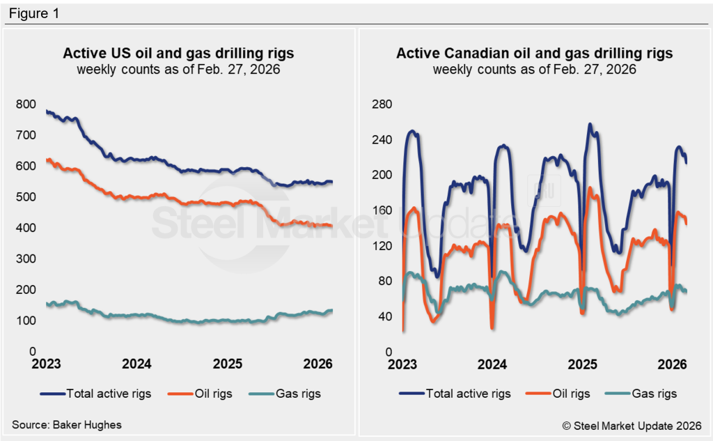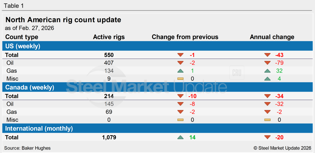 The latest Baker Hughes rig count report showed the US lost two net oil rigs but gained one gas rig in the week ending Feb. 27. The US in total had 550 rotary rigs in operation, down by 43 from the same week last year. Drilling for oil has slowed noticeably from last year, with 79 fewer rigs in operation. At the same time, gas drilling has picked up with 32 more rigs operating this year.